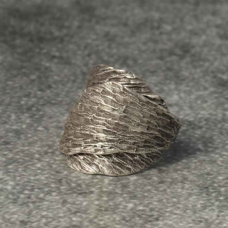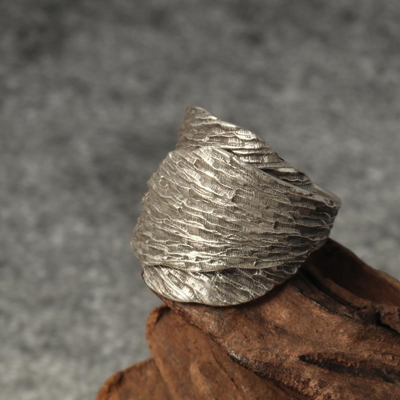 S925纯银泰国清迈手工银u戒指男女款复古树叶做旧可调节开口食指
