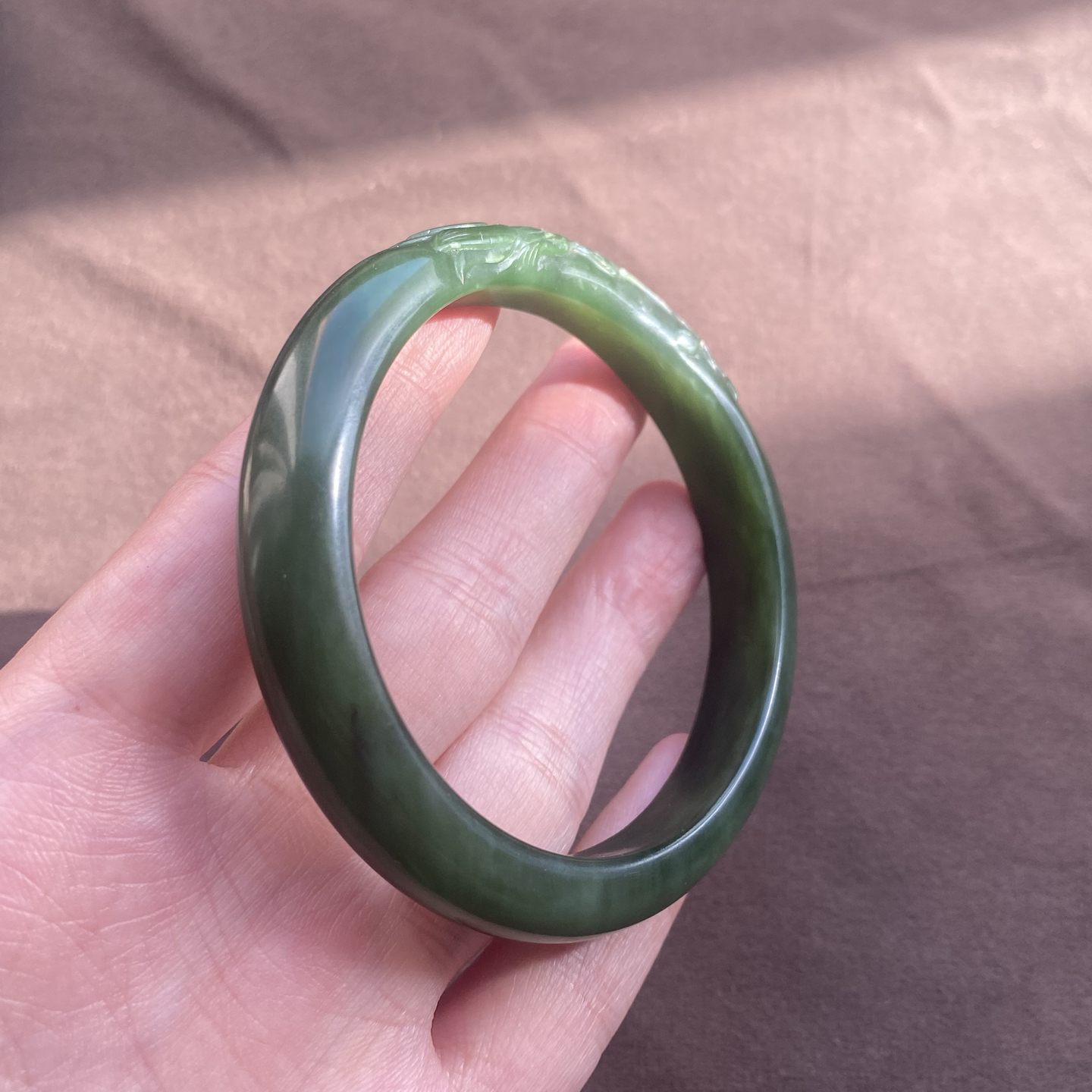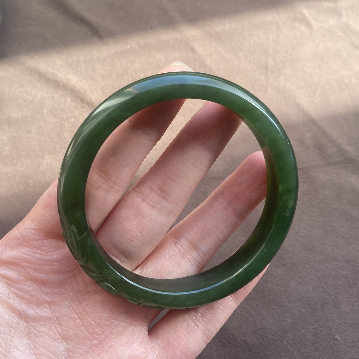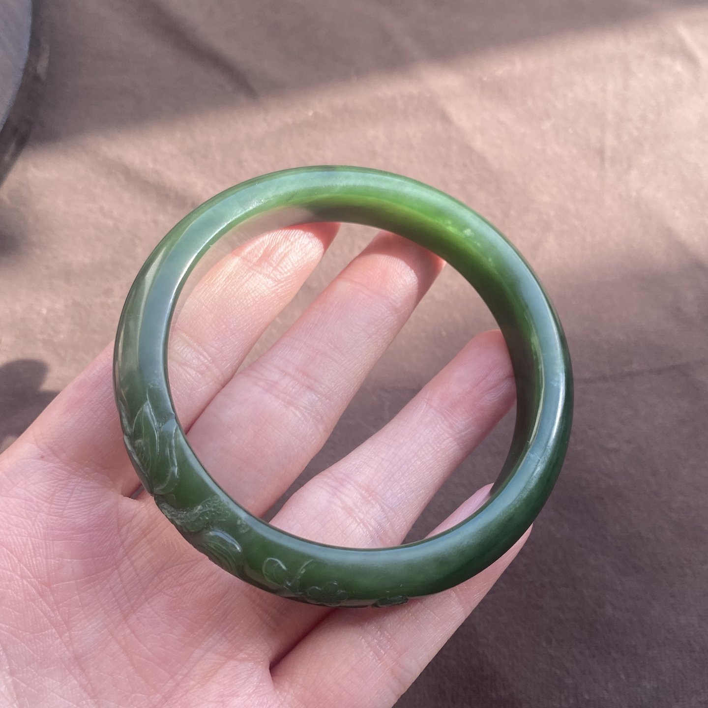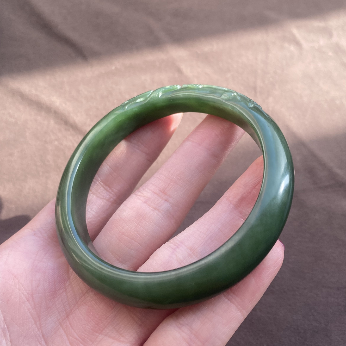 内径55.5mm天然和田玉手镯俄罗斯老料菠菜绿雕花色正装手镯子A