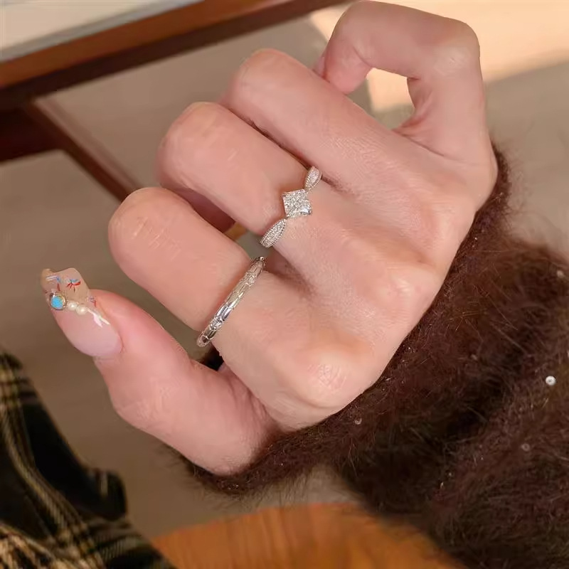 银色织布纹拉丝公主方莫桑钻戒指小众精致高级感