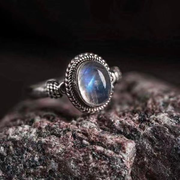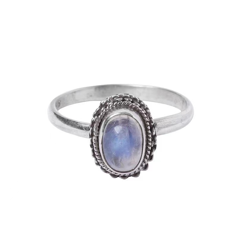尼泊尔饰品手工S925银天然月光石戒指月亮石捡漏复古蓝珀男女指环