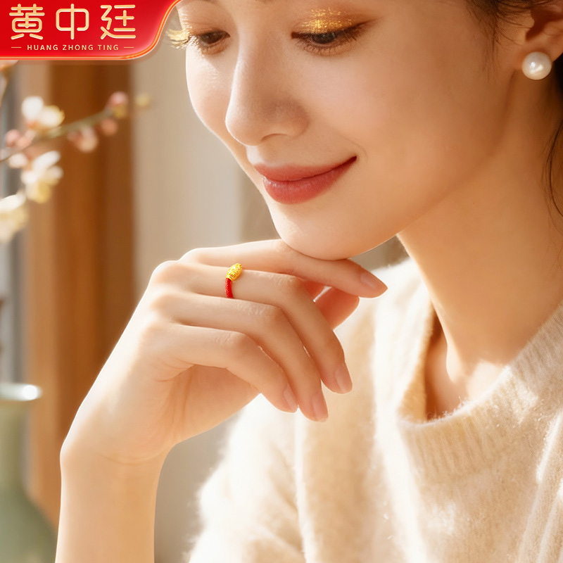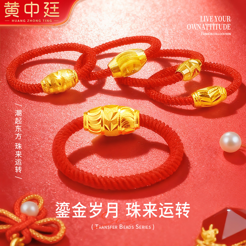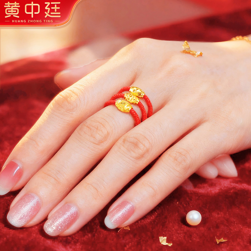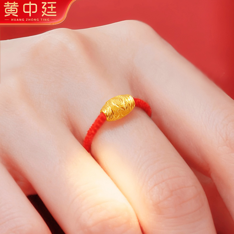 黄金转运珠戒指本命年红绳手链999足金幸运珠男女情侣情人节抖音