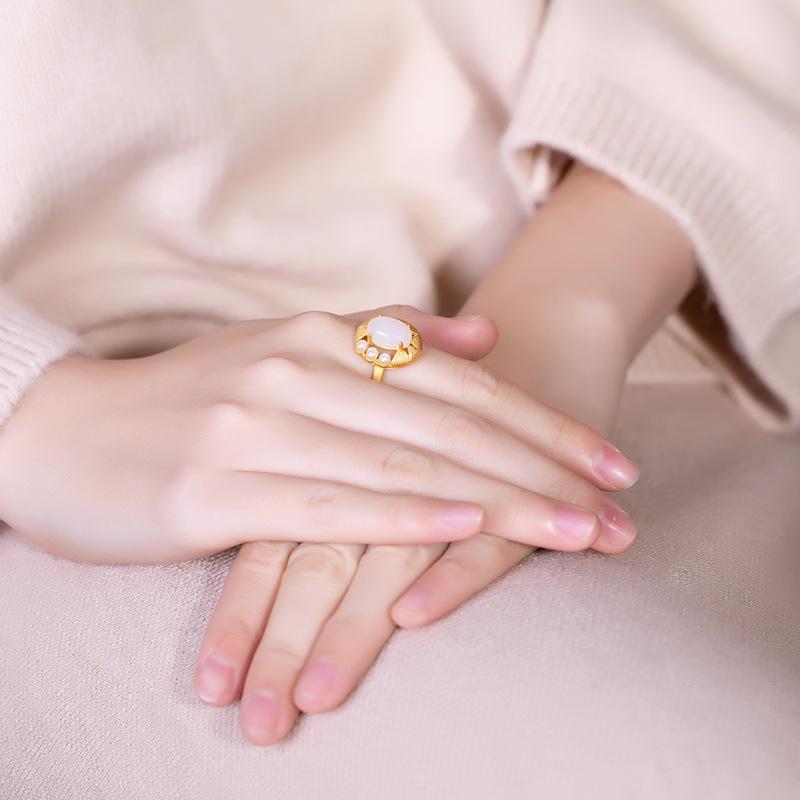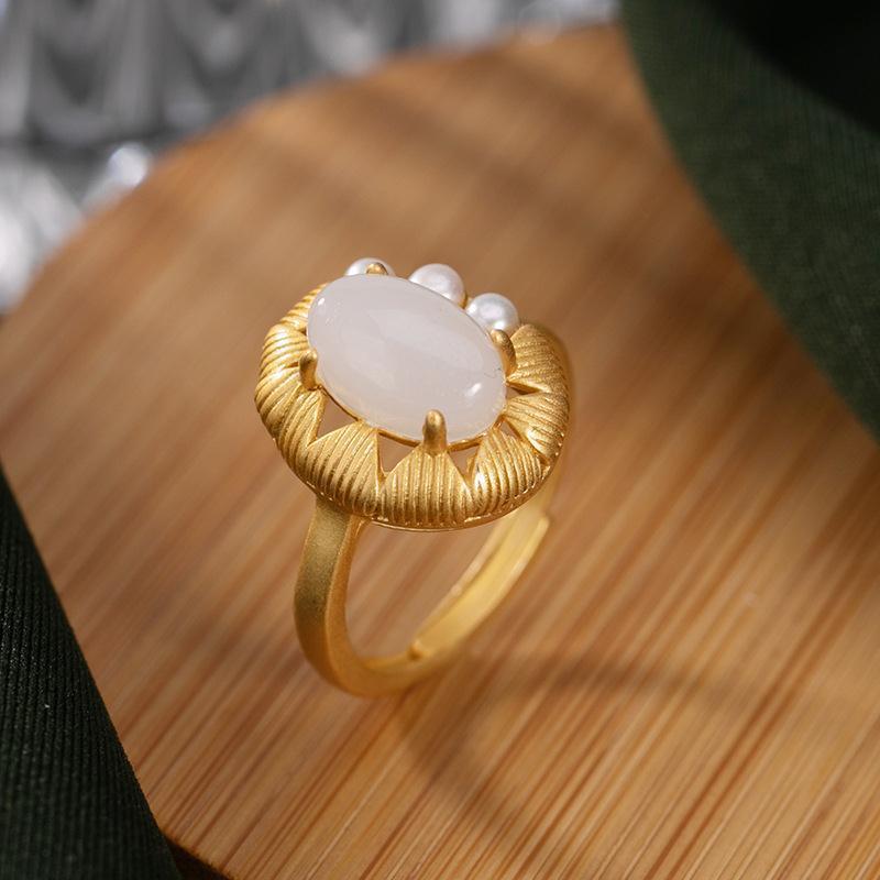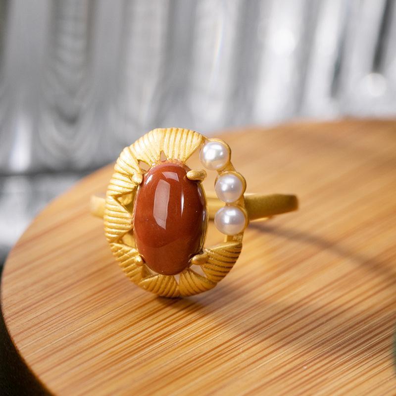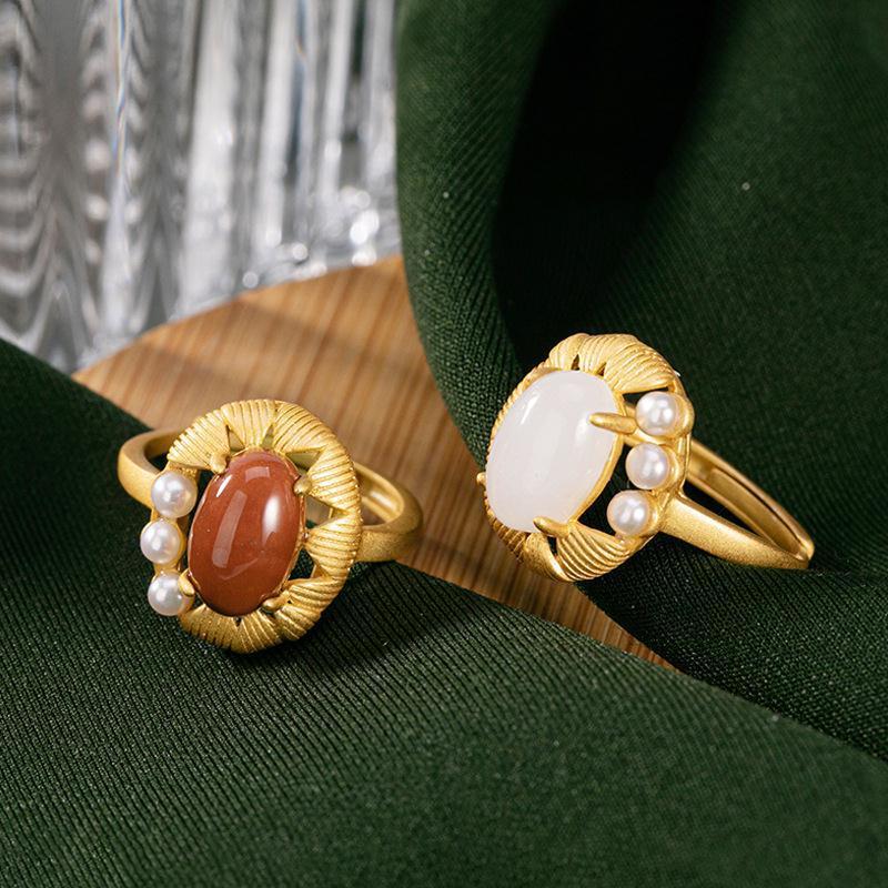 国风镀金活口戒指镶嵌红玉白玉高档气质民族风食指戒女款指环手饰