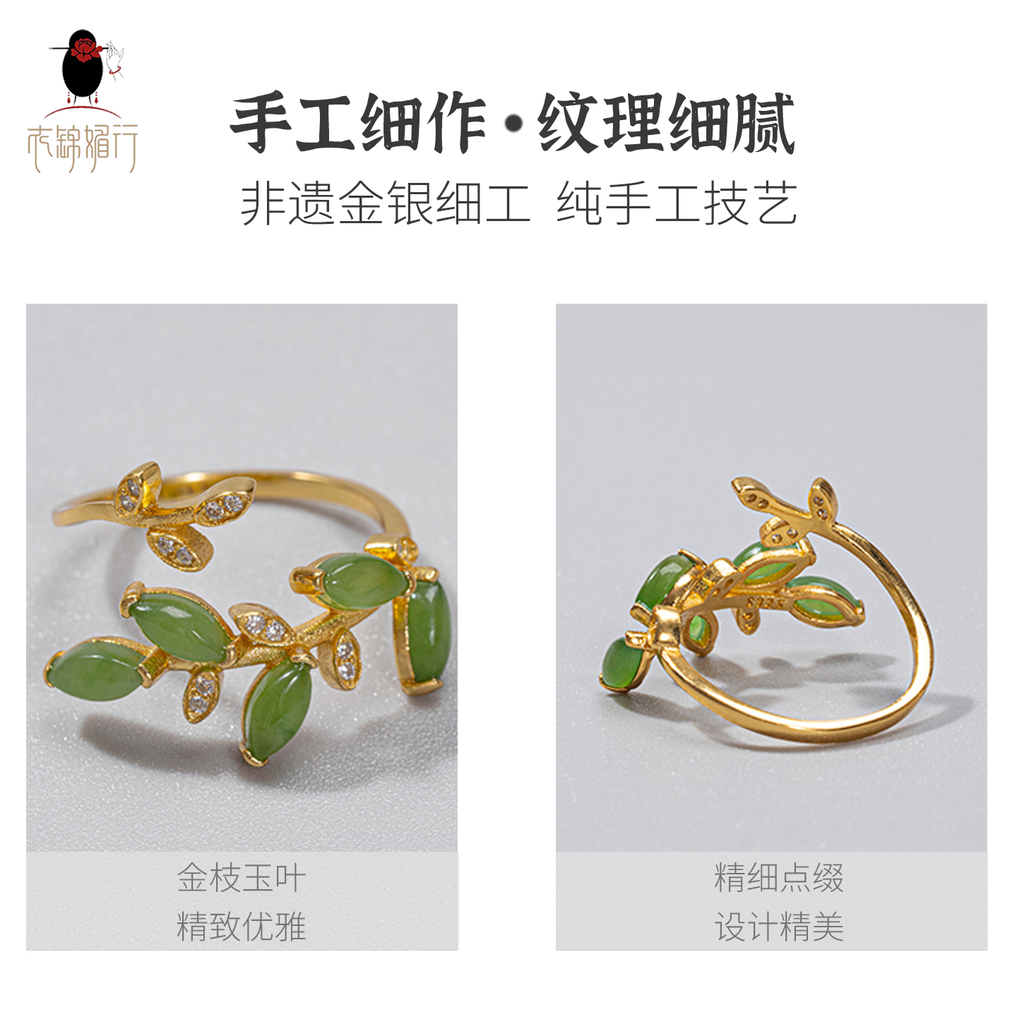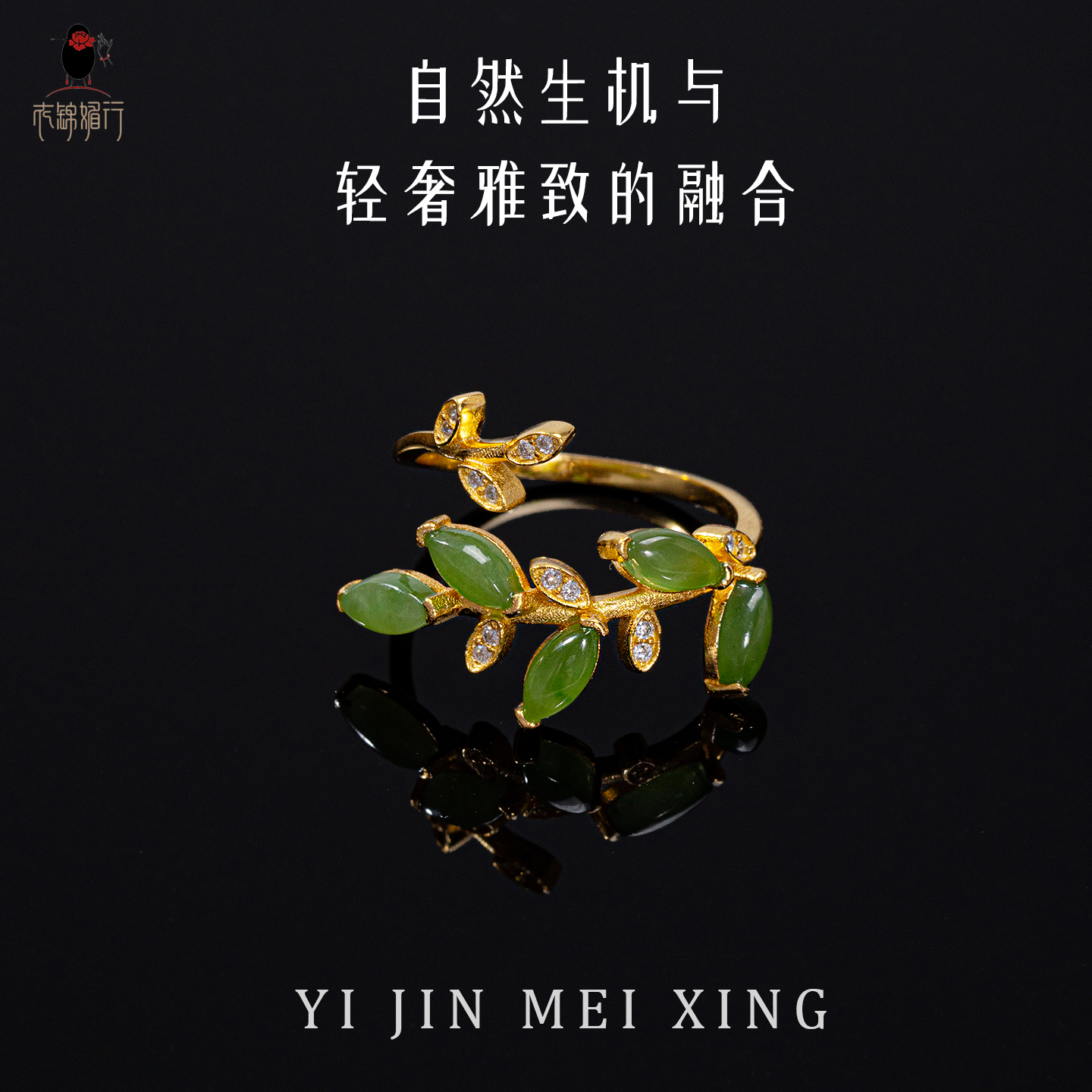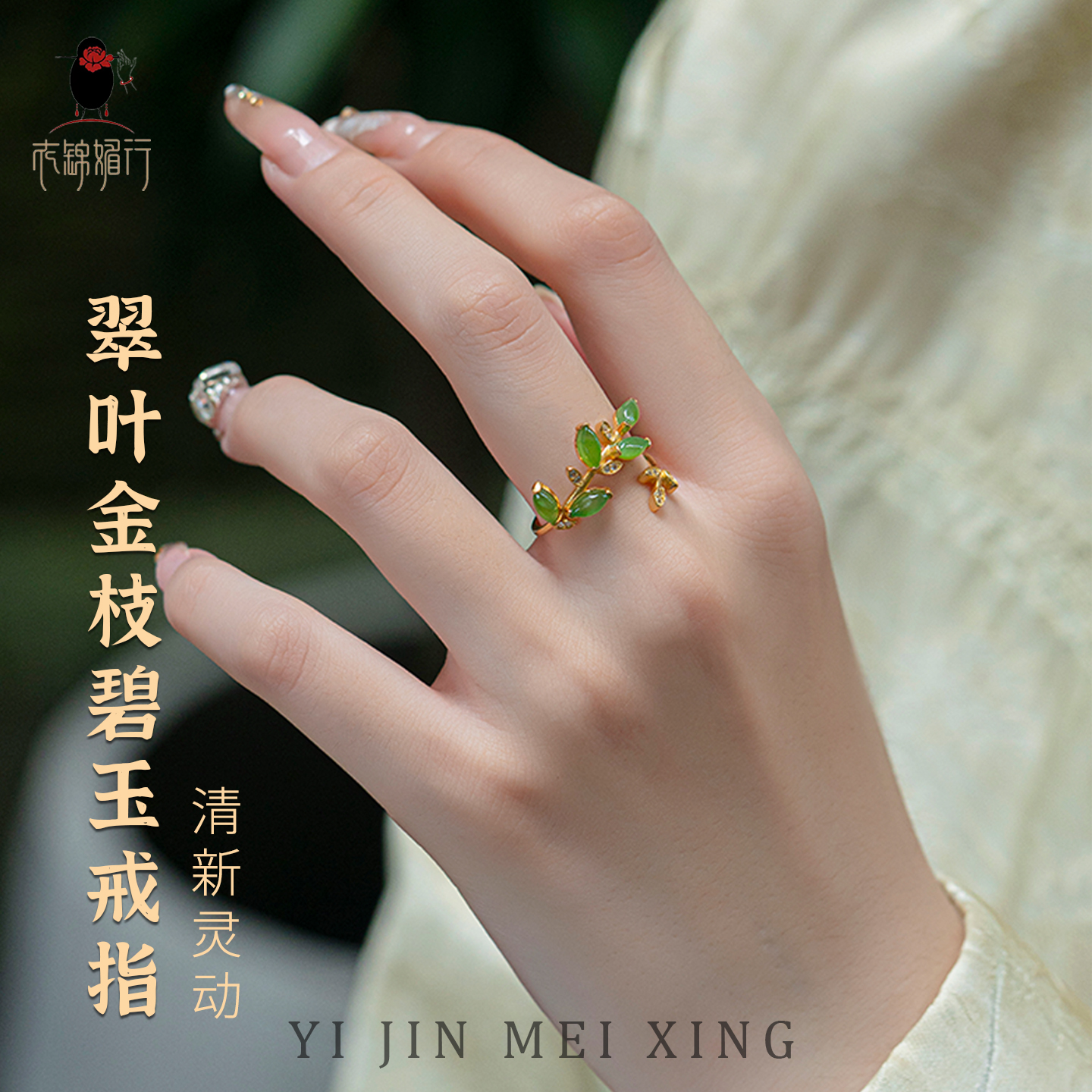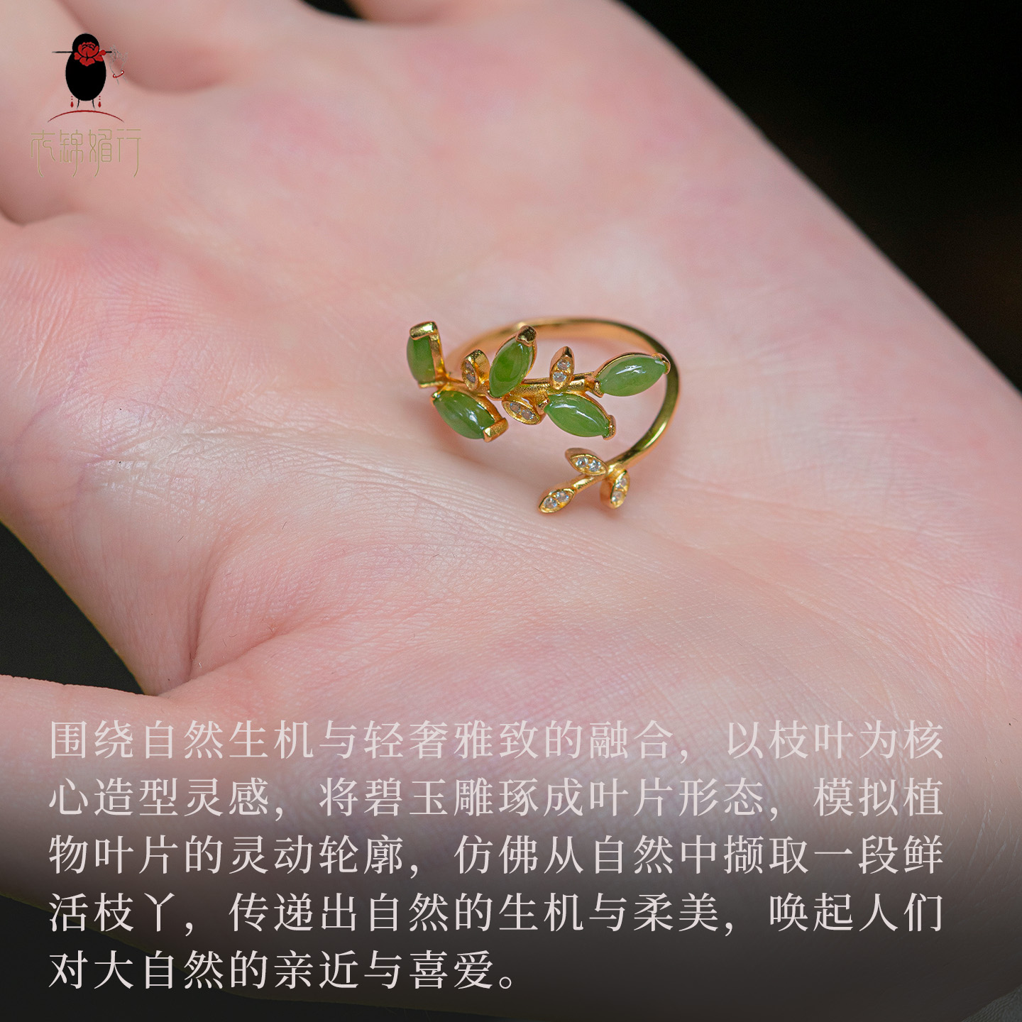 衣锦媚先银镀金镶和田碧玉戒指女叶子开口戒新中式轻奢精致玉指环