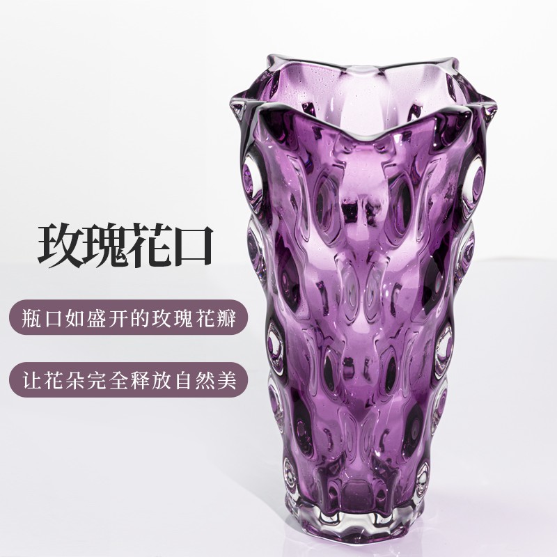 B233欧式紫色花口玻璃花瓶轻奢高级感透明琉璃客厅插花家居摆件