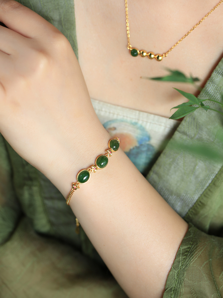 和田玉碧玉纯银18k包金手链女生 轻奢小众精致国风金镶玉手串手饰