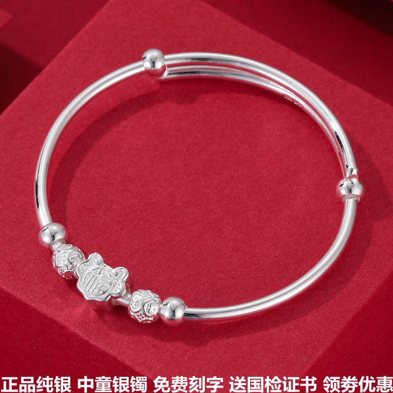 9999纯银手镯女祥云铃铛光面推拉实心足银镯子小众定制刻字送女友