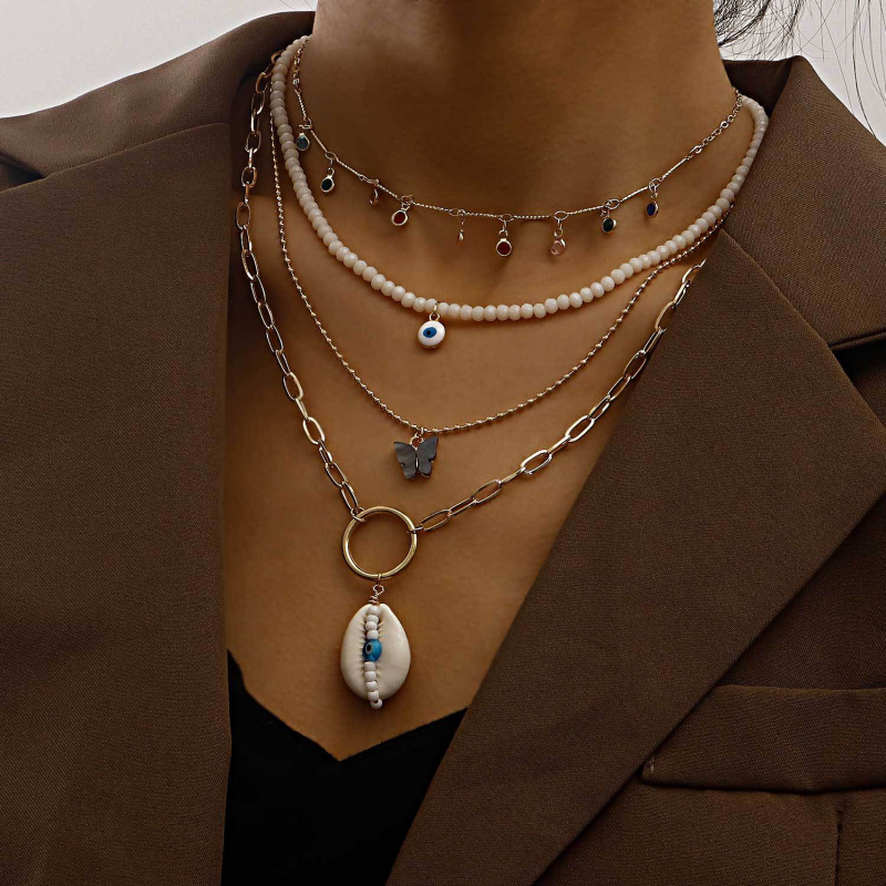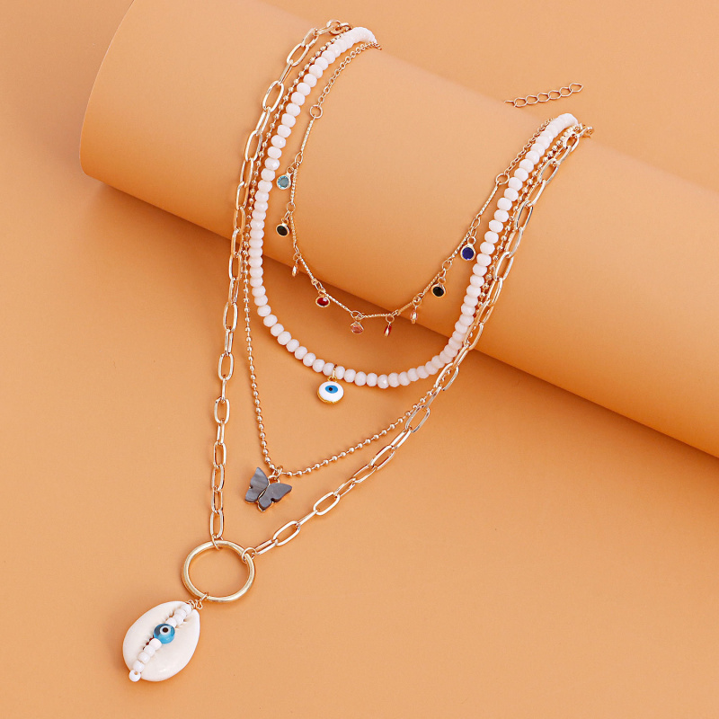 欧美跨境饰品 潮流多层七彩锆石白色米珠黑色蝴蝶贝壳吊坠项链女