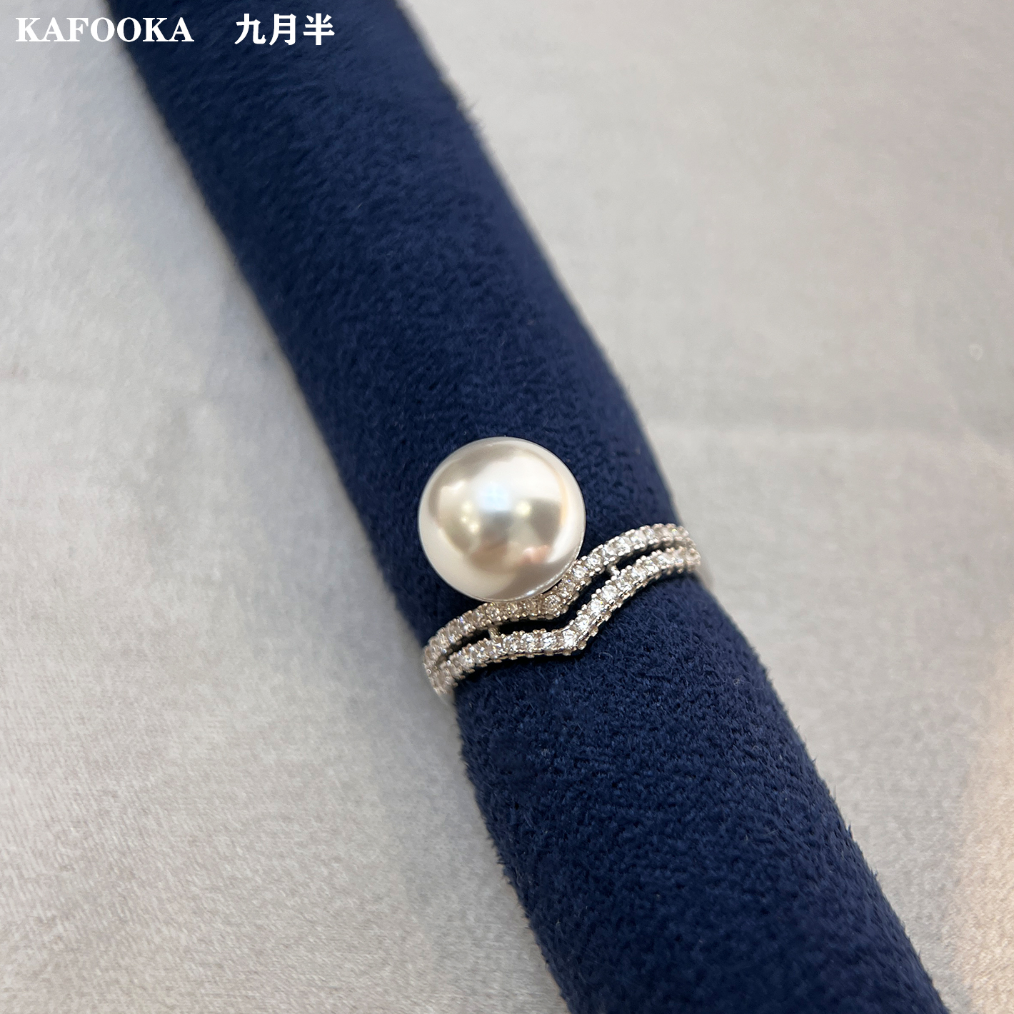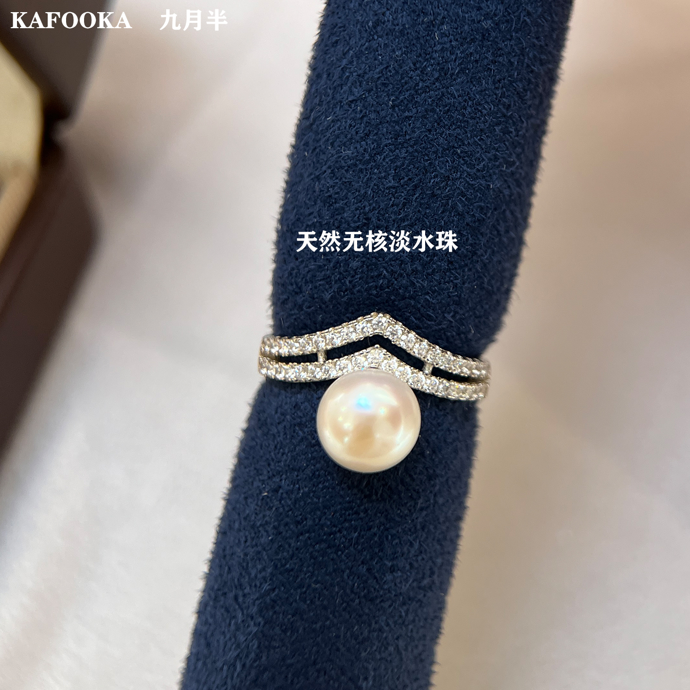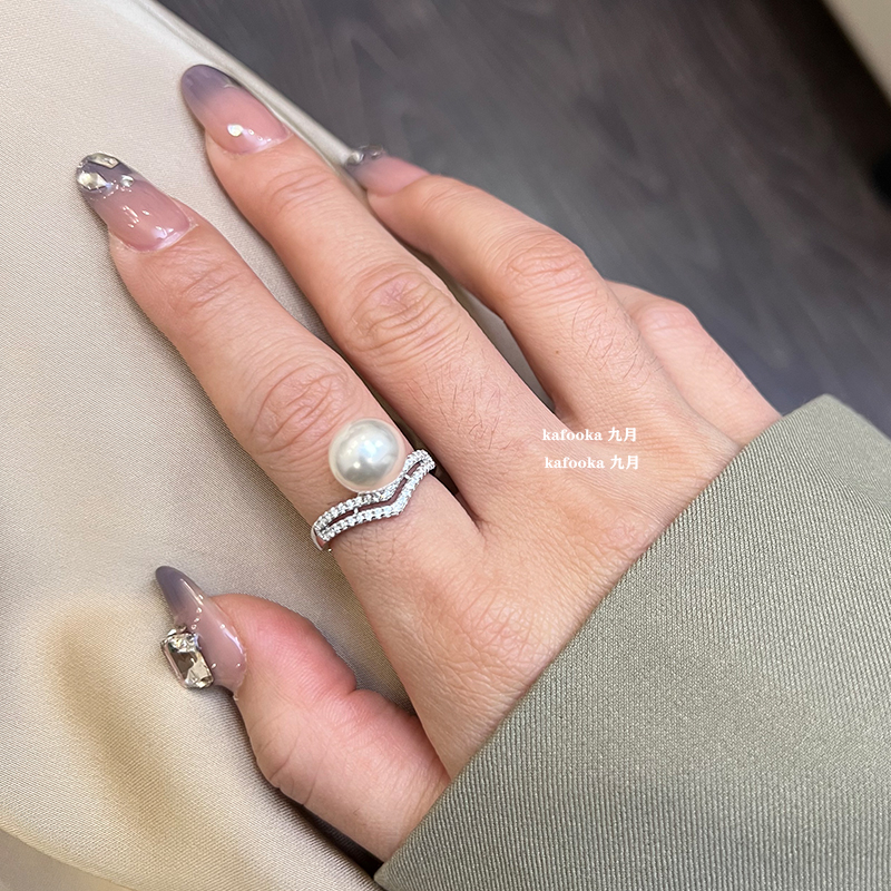 【皇冠】V形设计S925纯银施家澳白珍珠戒指 bb闪高碳钻开口指环女