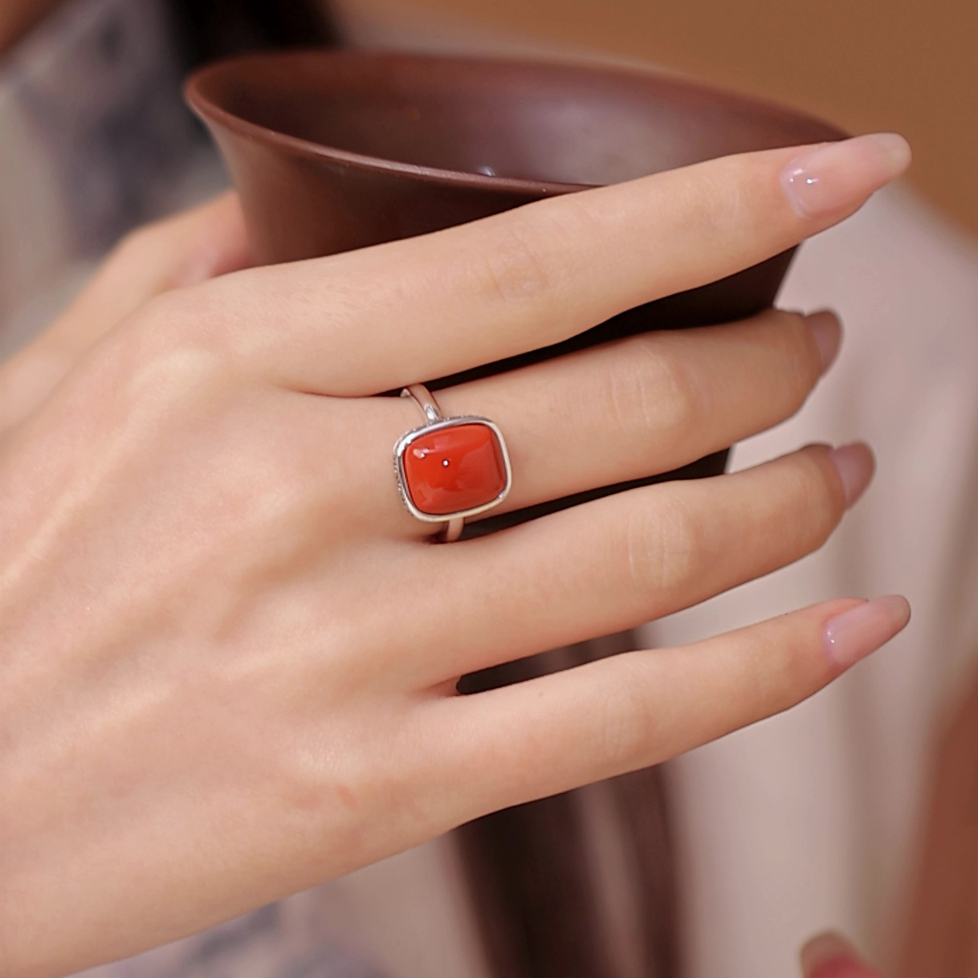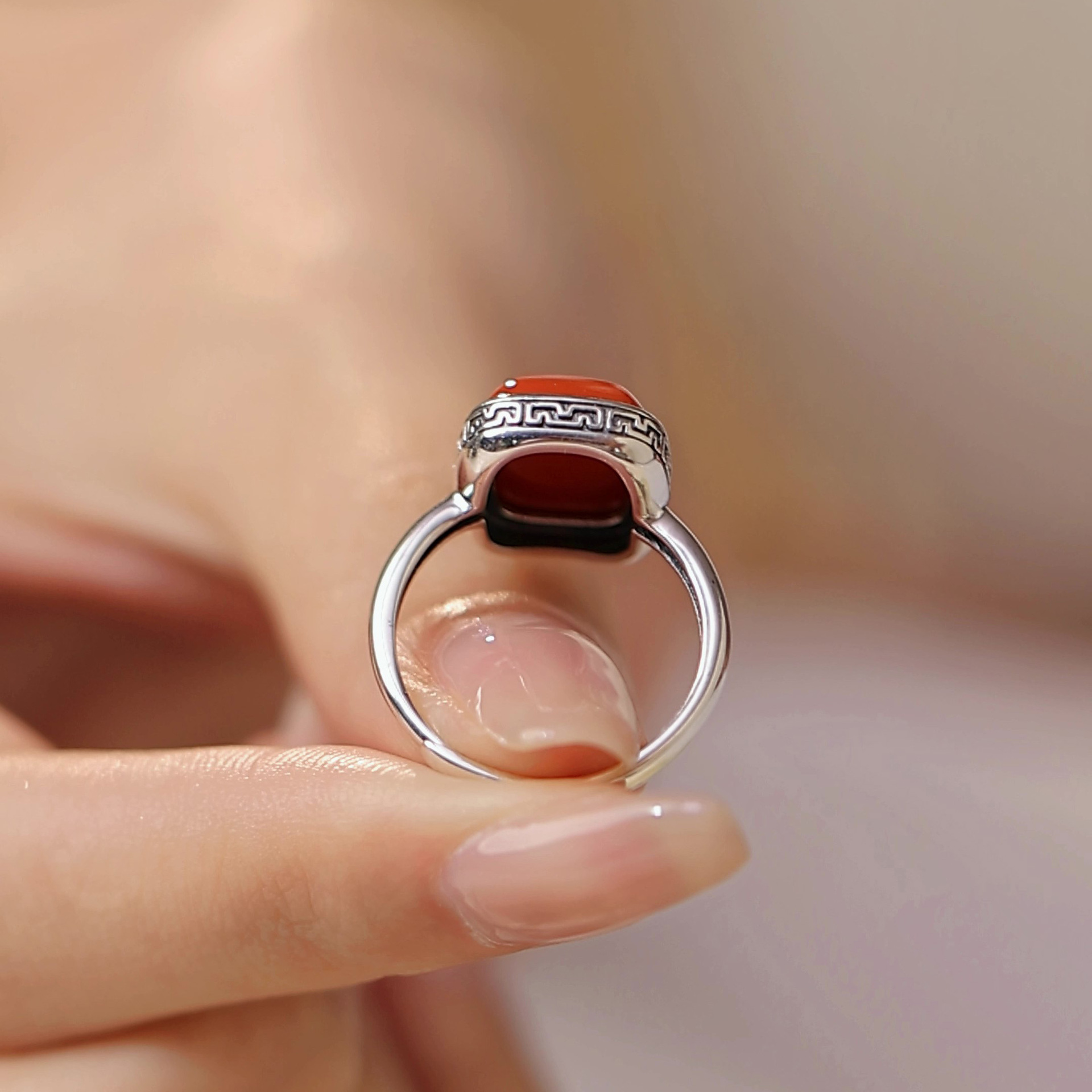 经典方戒S925纯银天然南红玛瑙和田玉旺财戒指女中国风高级感指环