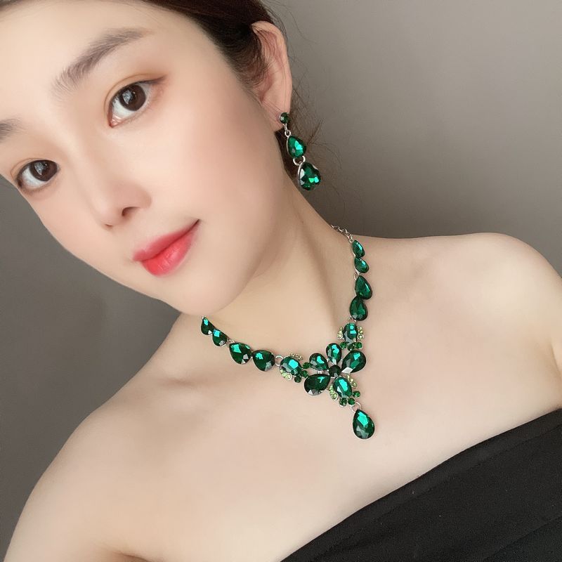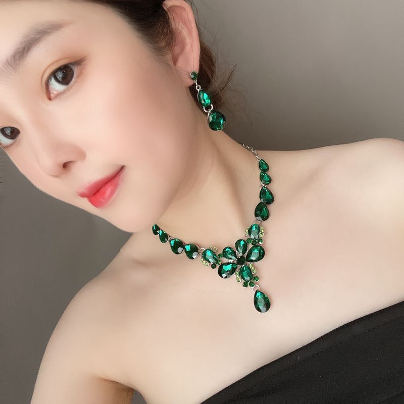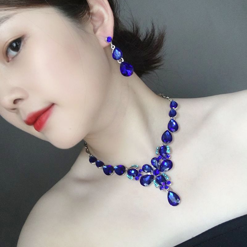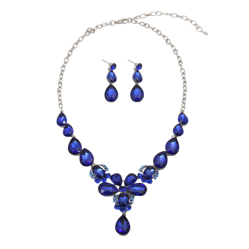 亚马逊电商欧美水晶宝石锁骨短项链耳环套装水滴潮女配饰首饰套装