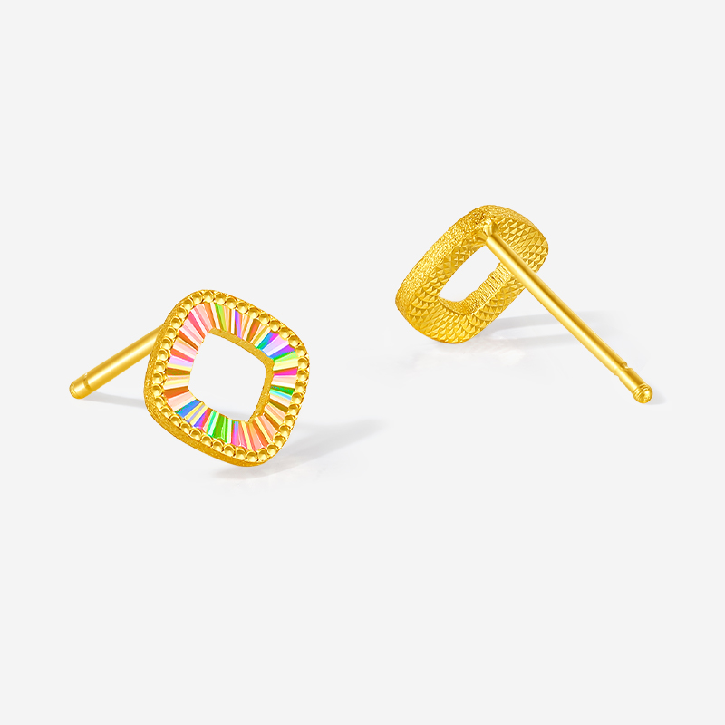 周六福5G黄金耳钉女计价足金几何方形幻彩耳饰送女友节日礼物