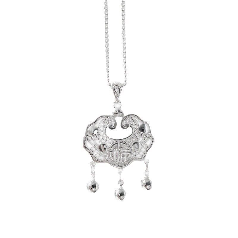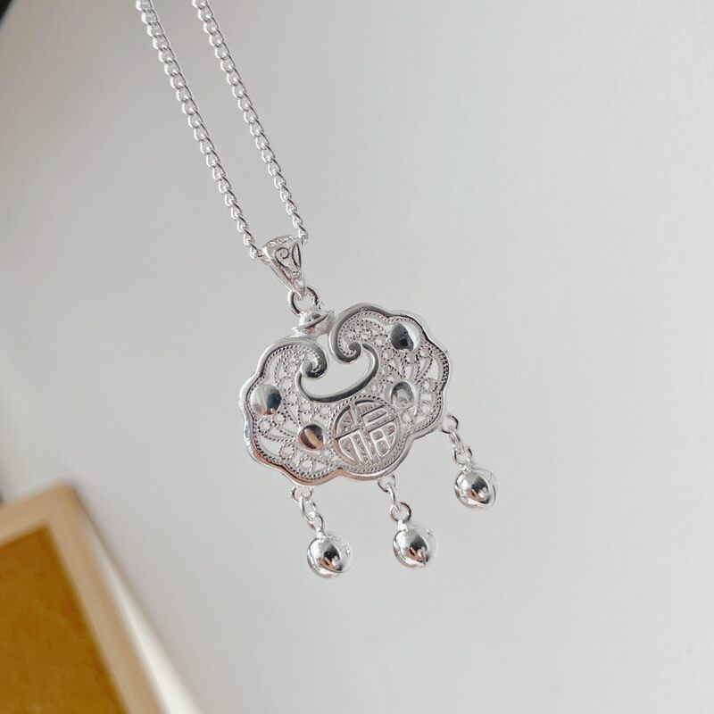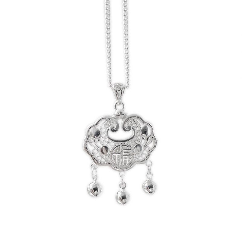 s990纯银宝宝长命锁足银999福字锁包镂空花丝童锁宝宝铃铛锁吊坠