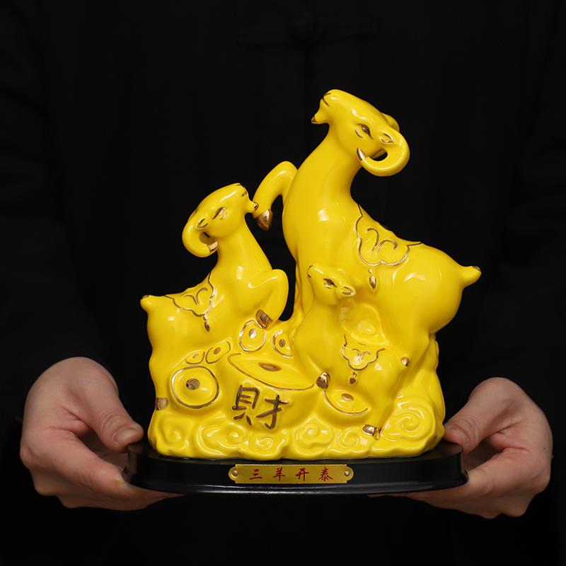 陶瓷三羊开泰羊摆件黄色招财补角家居风水客厅三阳开泰陶瓷工艺品
