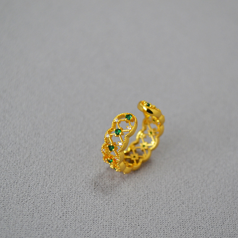 法式复古宫廷风镂空蕾丝绿色锆石闪钻黄铜镀金轻奢开口可调戒指女