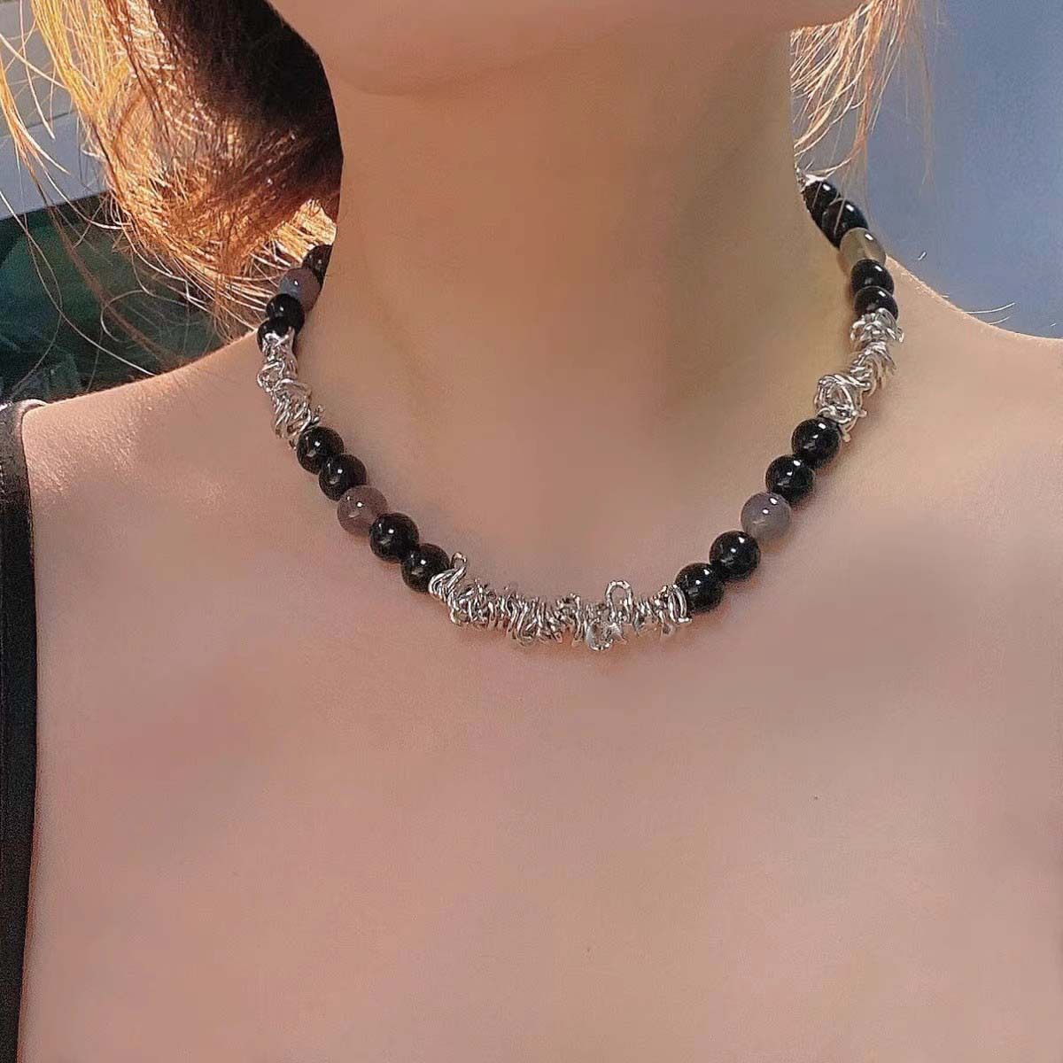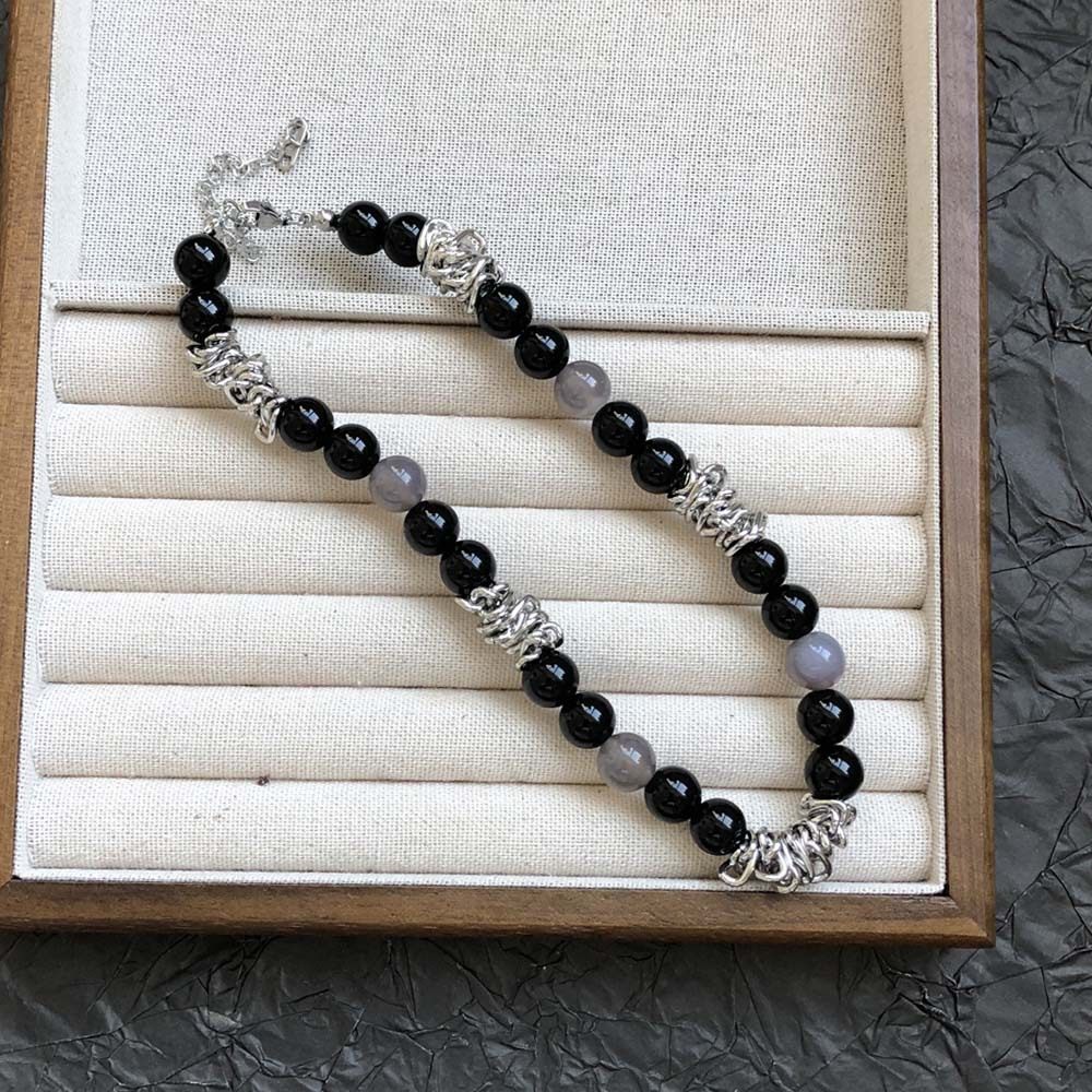 不规则荆棘项链黑色玛瑙天然石拼接串珠锁骨链小众设计感项链