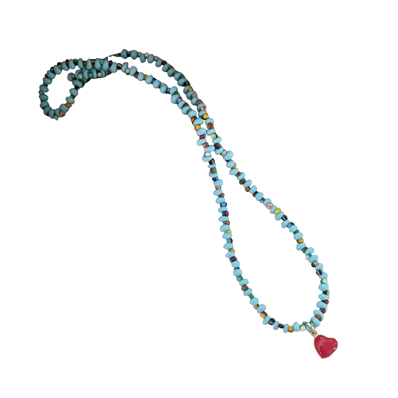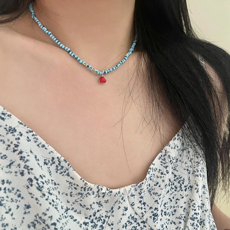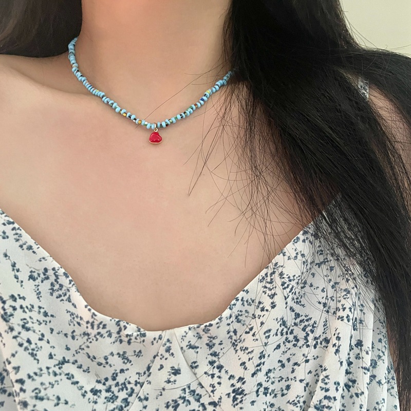 夏日新款蓝色串珠项链红心小众锁骨链个性设计感颈链ins风韩版女~