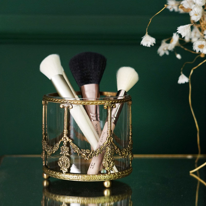 费灵家居欧式复古雕花黄铜玻璃收纳桶化妆刷笔筒桌面轻Z奢摆件进