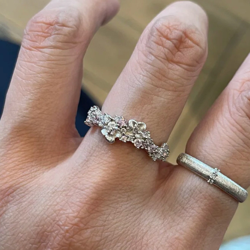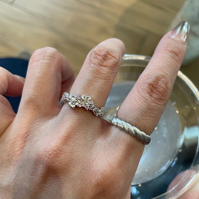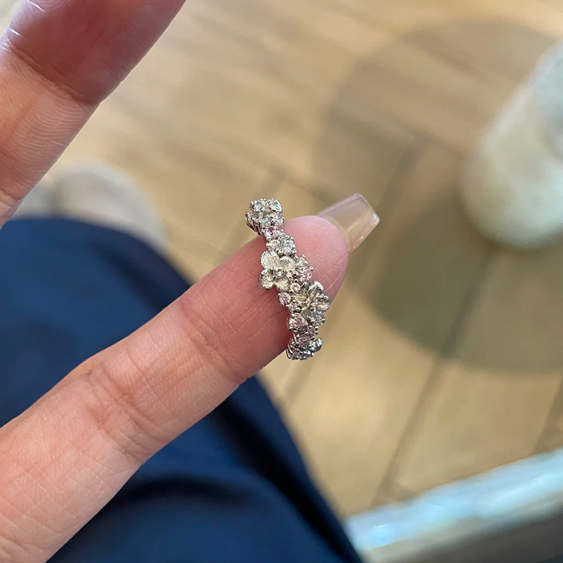 格调小红书爆款精致粉钻四叶花拉丝排钻戒指高级感气质时尚戒指