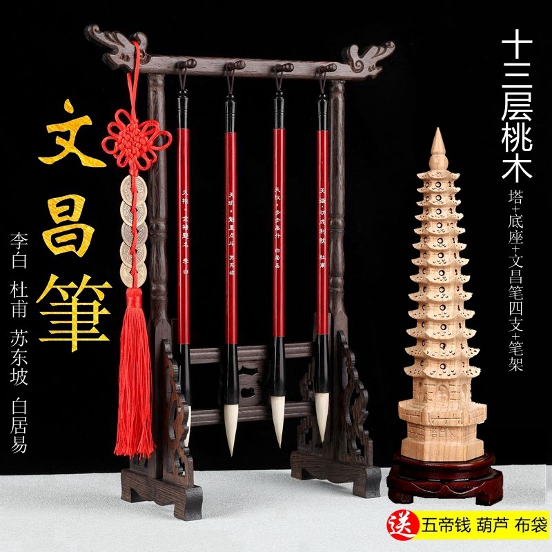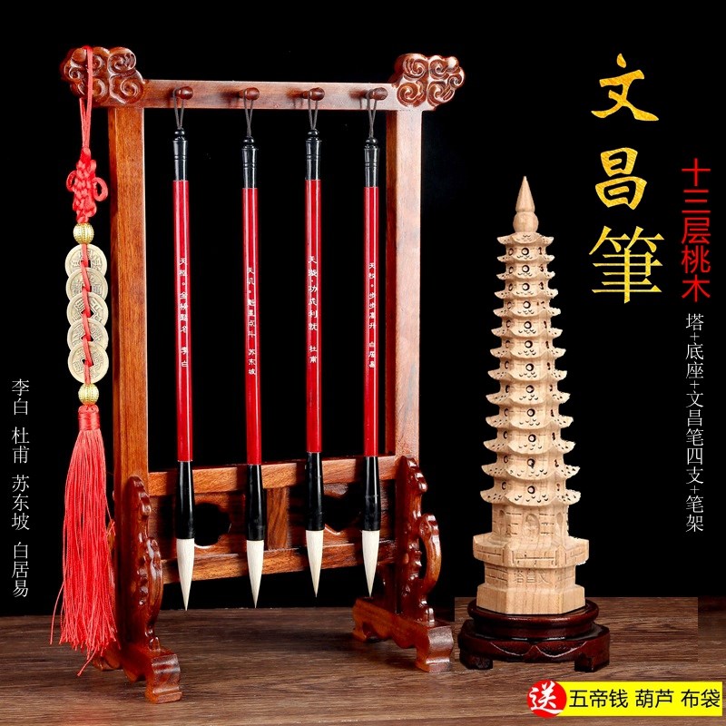 文昌毛笔4支+十三层文昌塔木质笔架学生书L桌办公摆件刻诗人布局