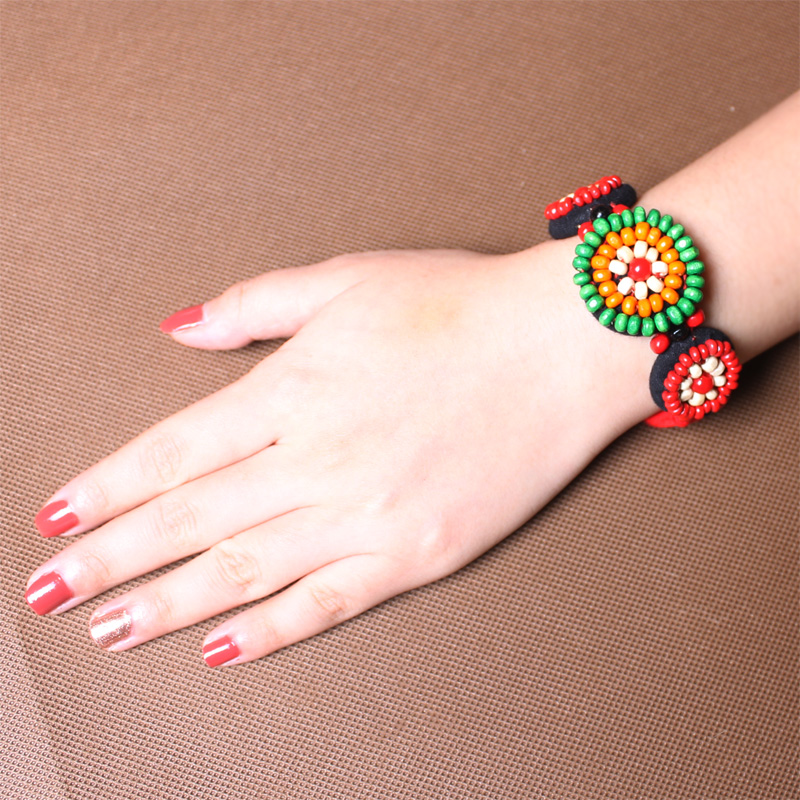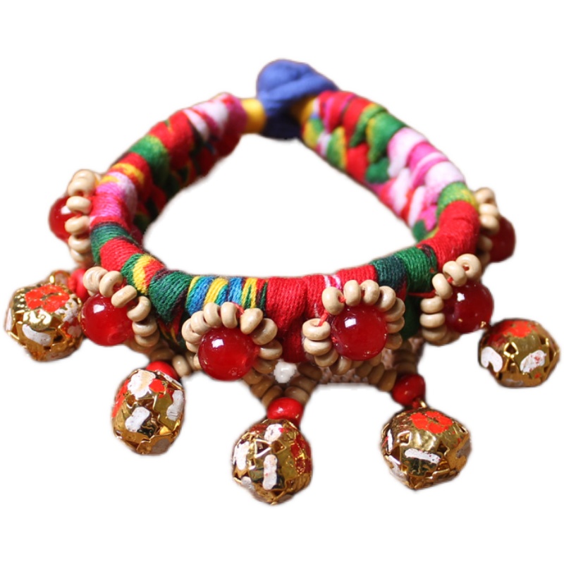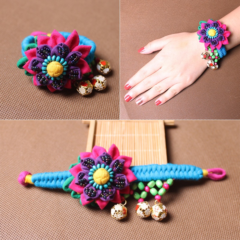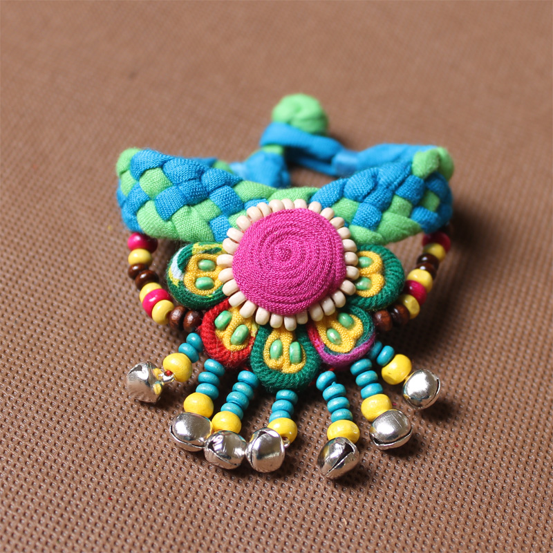 云南民族风手工编织手链花卉舞蹈布艺铃铛护腕生创意儿童手串