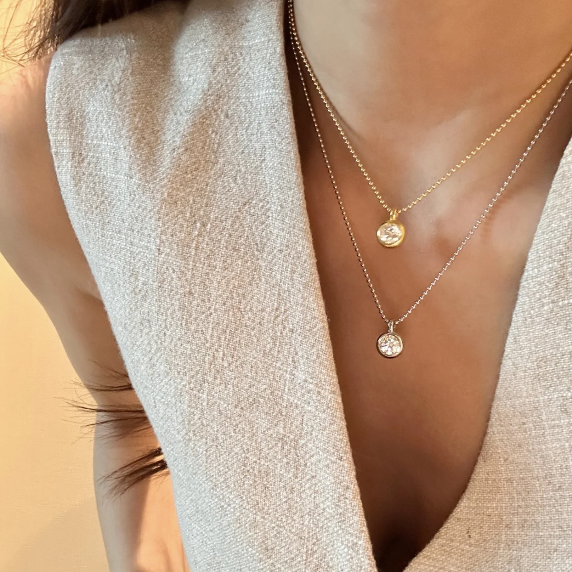 S925银镀金超厚金ins风叠戴泡泡圆钻大本钟抽拉圆珠调节项链