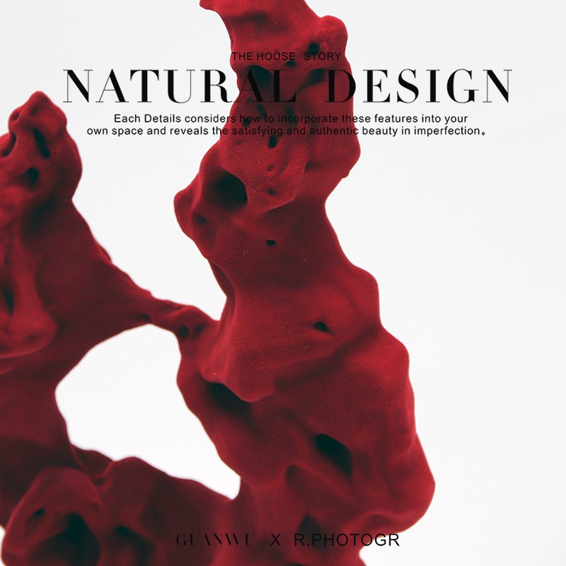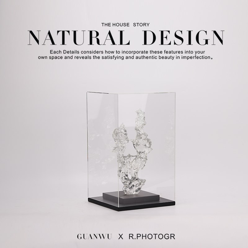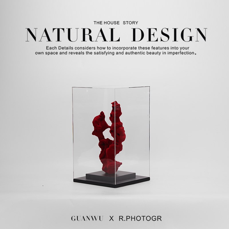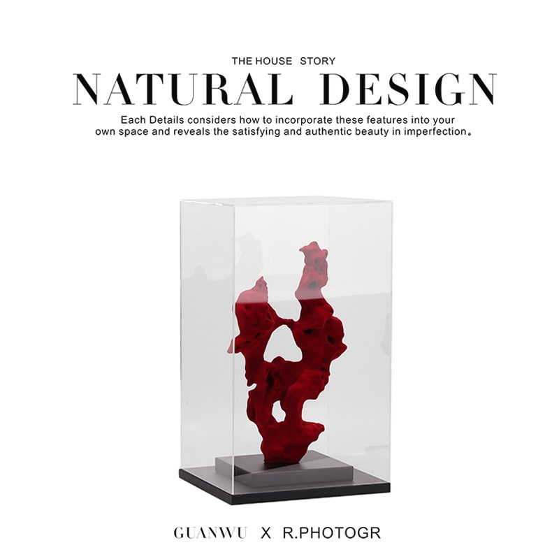 现代新中式红色植绒太湖石亚克力罩摆件展厅酒店大堂玄关隔断饰品