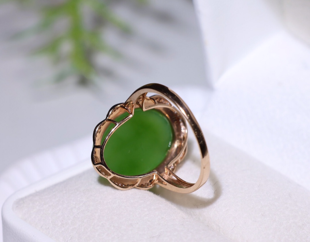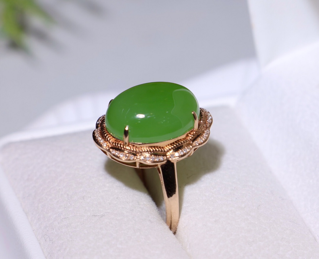 年货节礼新疆和田玉戒指女 厚金满钻苹果绿碧玉蛋面镶嵌18k金指环