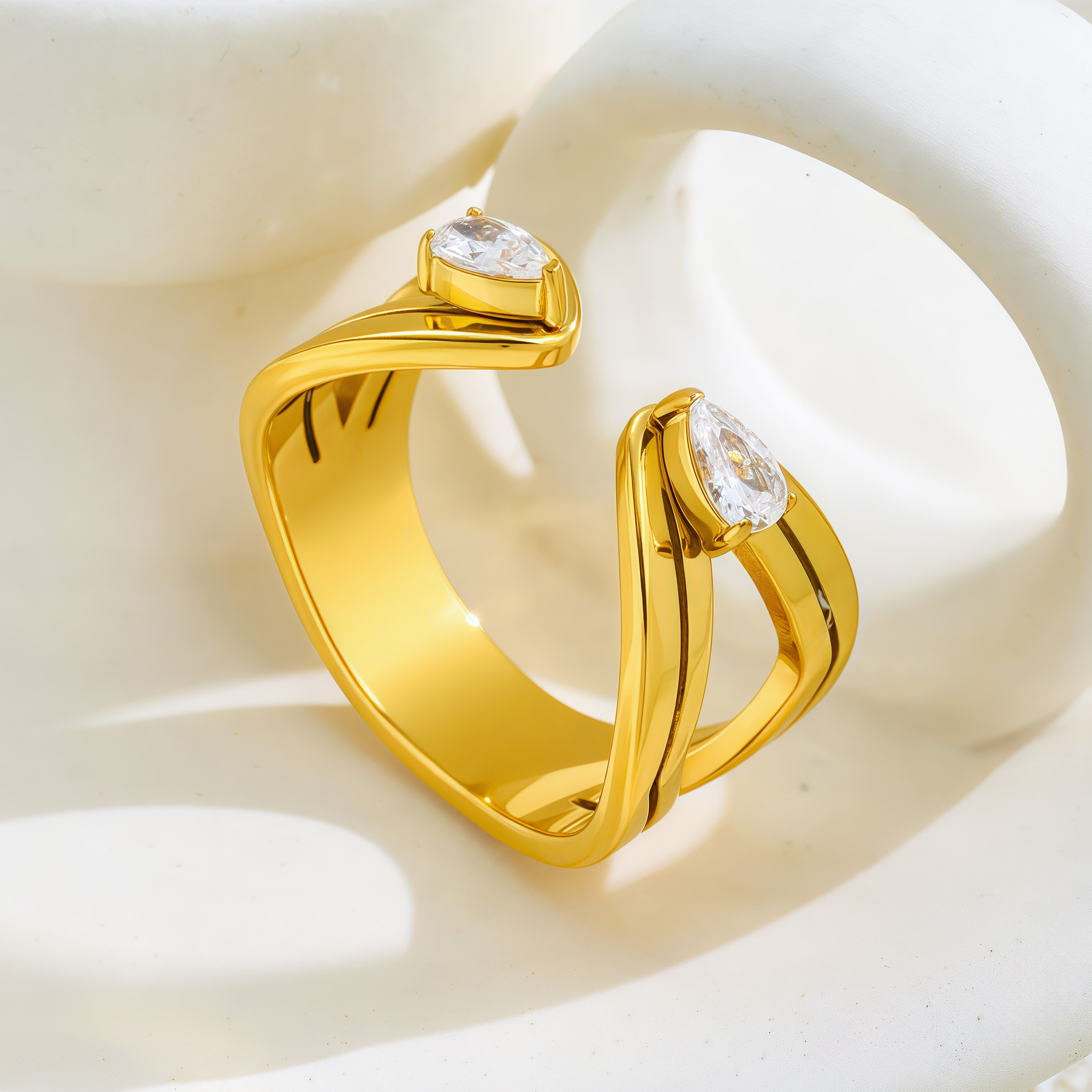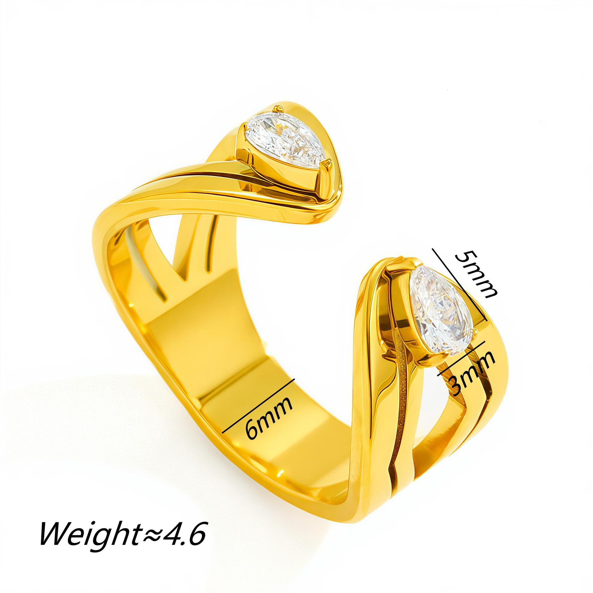 流行时尚欧美双头镶嵌水滴钻开口戒指钛钢镀18K金指环女个性小众