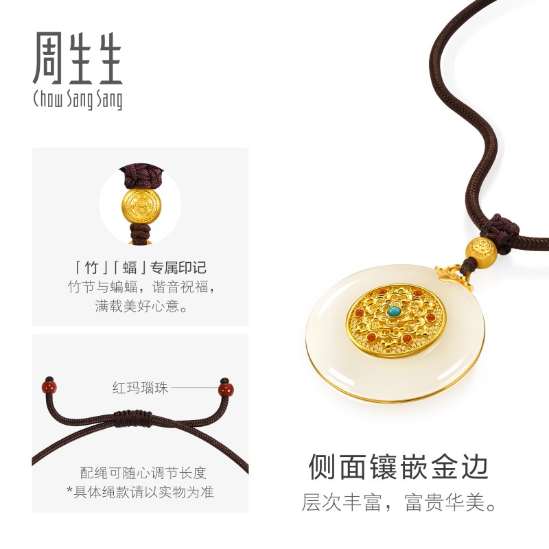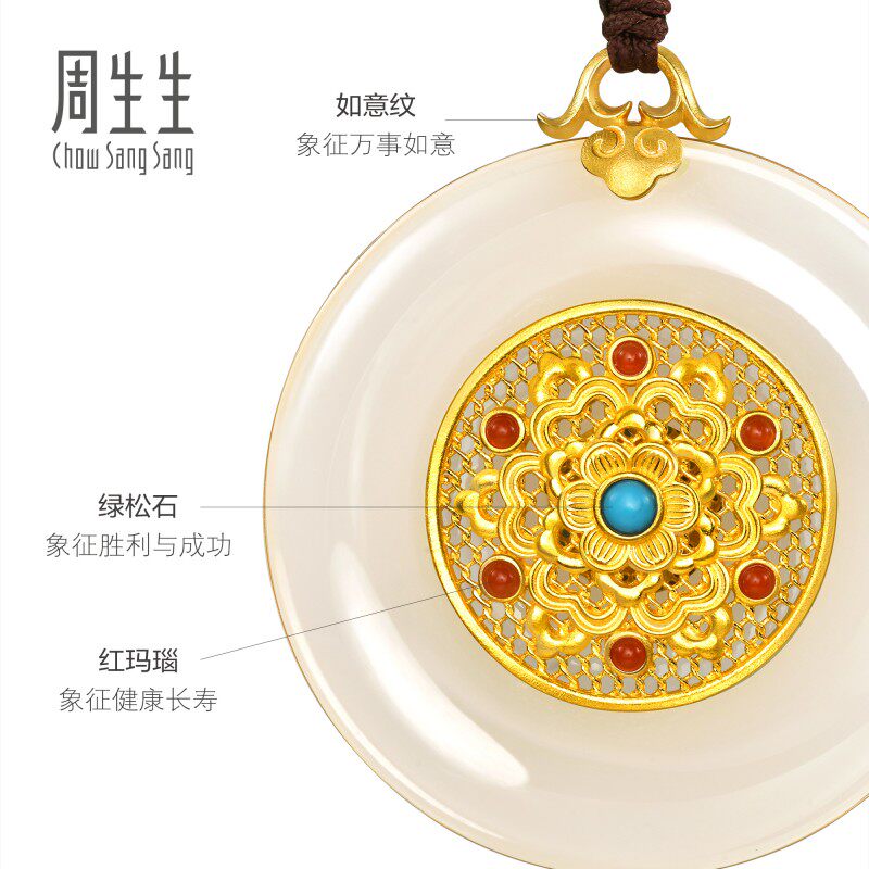 圣诞礼物周生生东方古祖足金镶嵌和田玉平安扣古法黄金颈饰94558Z
