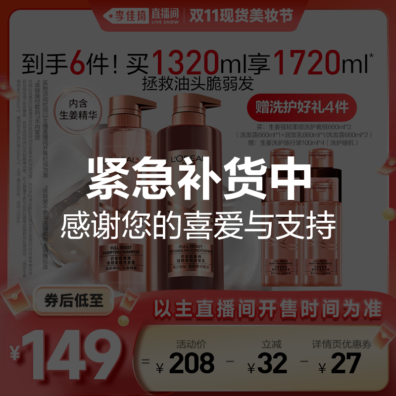 【李佳琦直播间婚庆专场】欧莱雅活力姜洗发水套装强韧发丝*