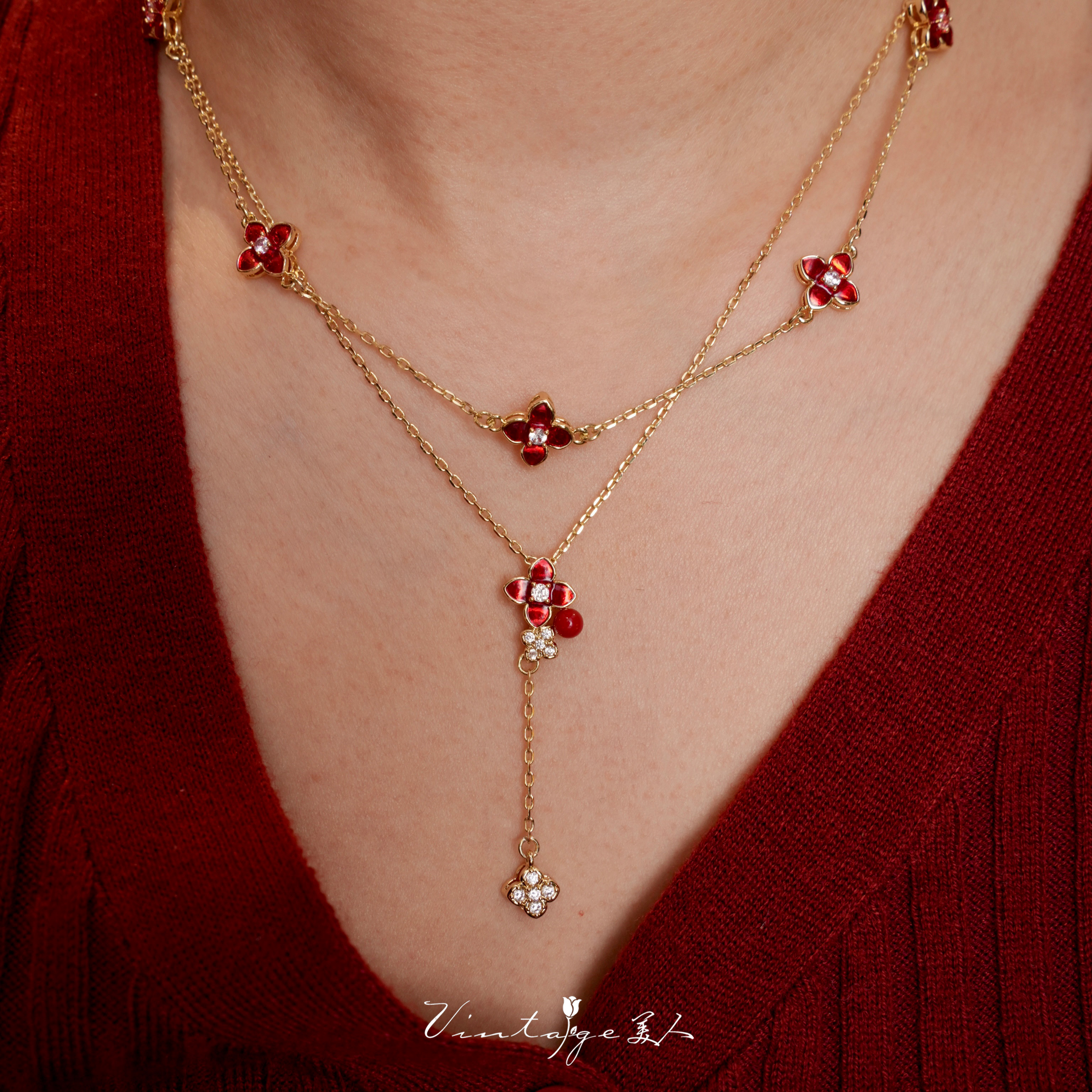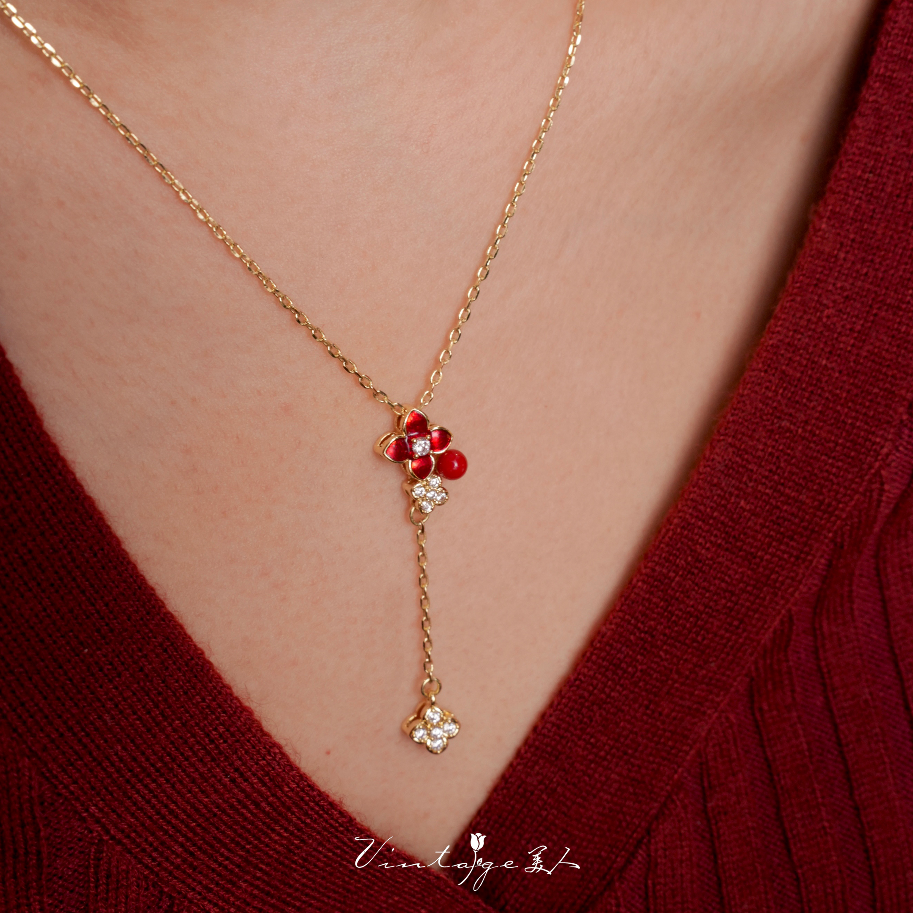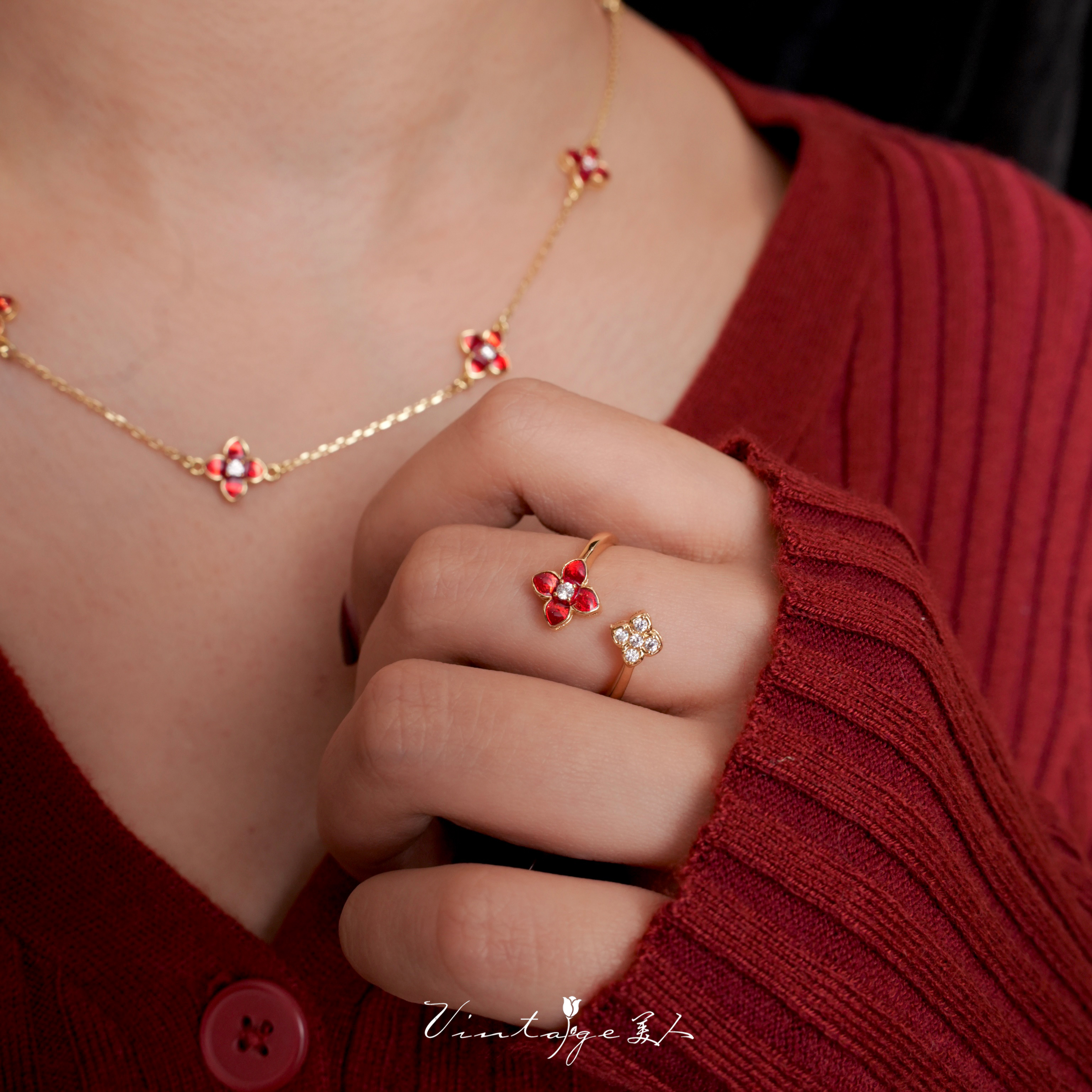 「馥郁红」系列复古轻奢设计感小众高级新年红色四叶草戒指/项链
