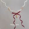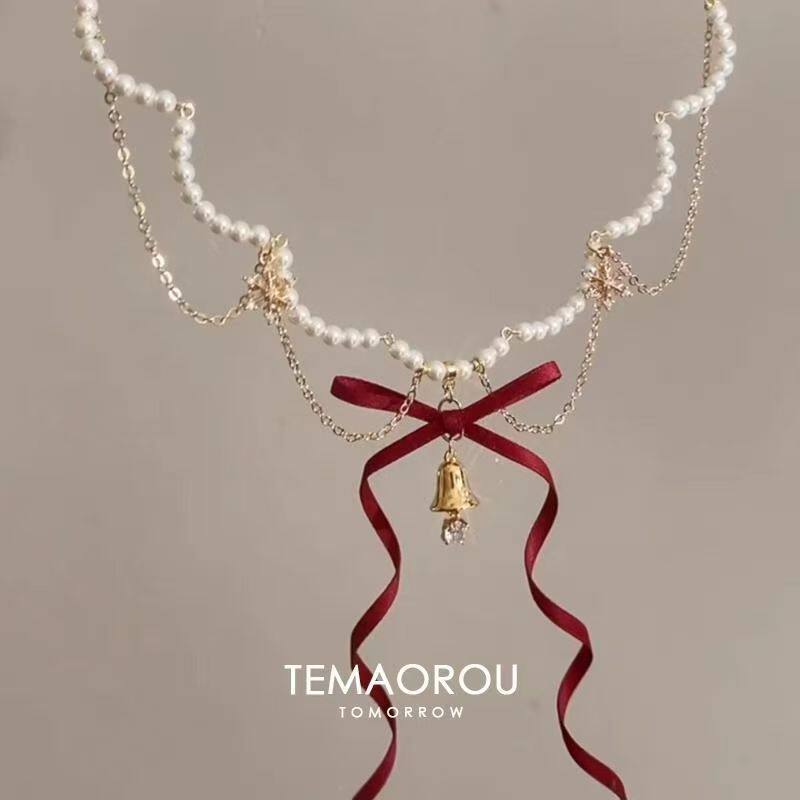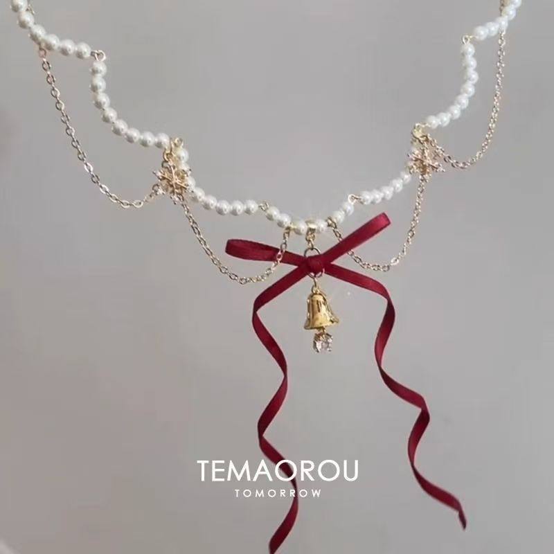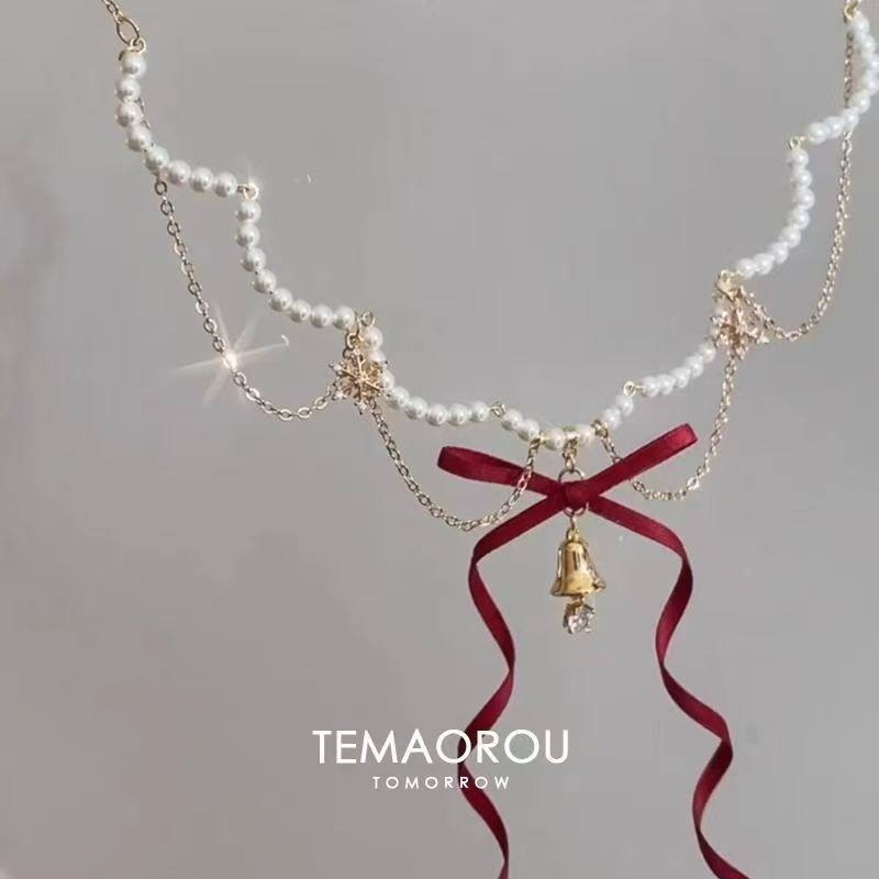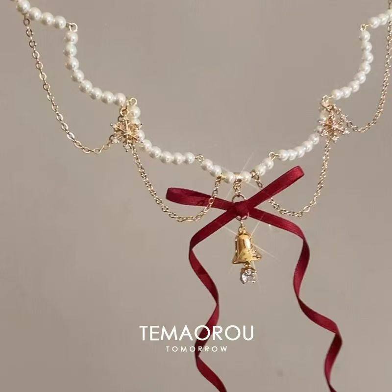 当前位置:首页>商品详情>圣诞~多层红色蝴蝶结金摇铃吊坠珍珠项链秋冬新款毛衣链颈链铃铛