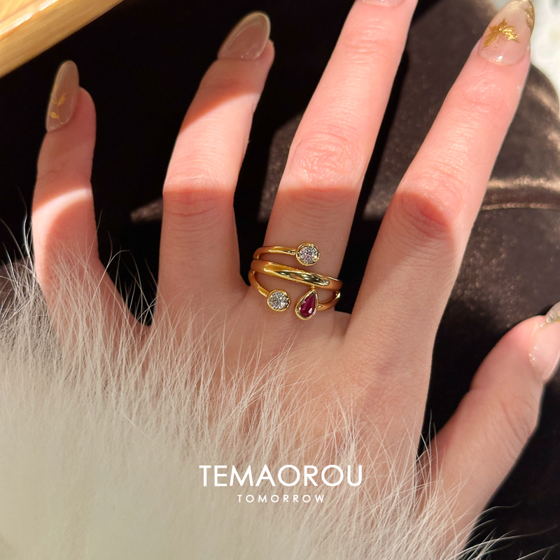 vinatger中古风三钻水滴红宝石戒指女叠戴食指戒指精致指环