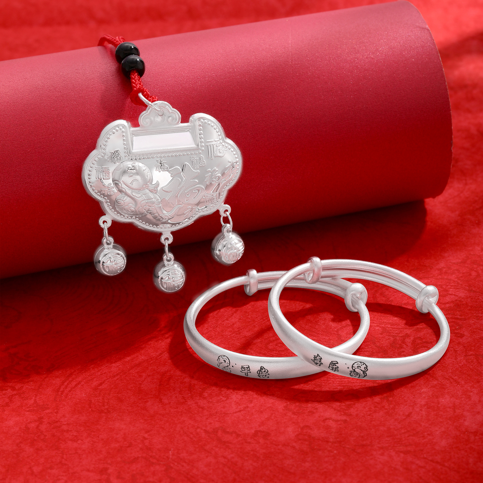 满月周岁宝宝9999纯银童镯本命年生肖蛇儿童婴儿锁包时尚套装礼物