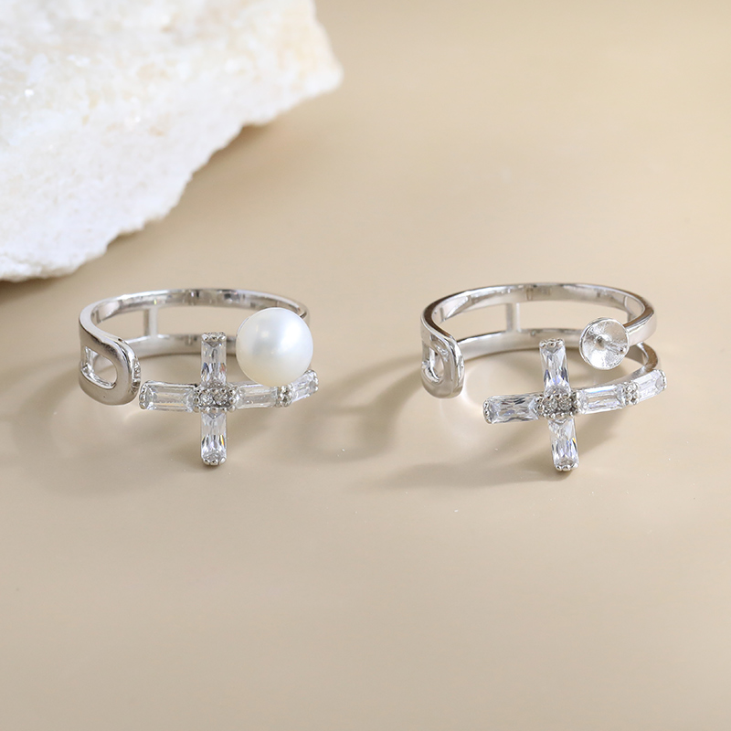 新款S925纯银珍珠戒指女简约气质ins十字架开口可调节指环DIY手工