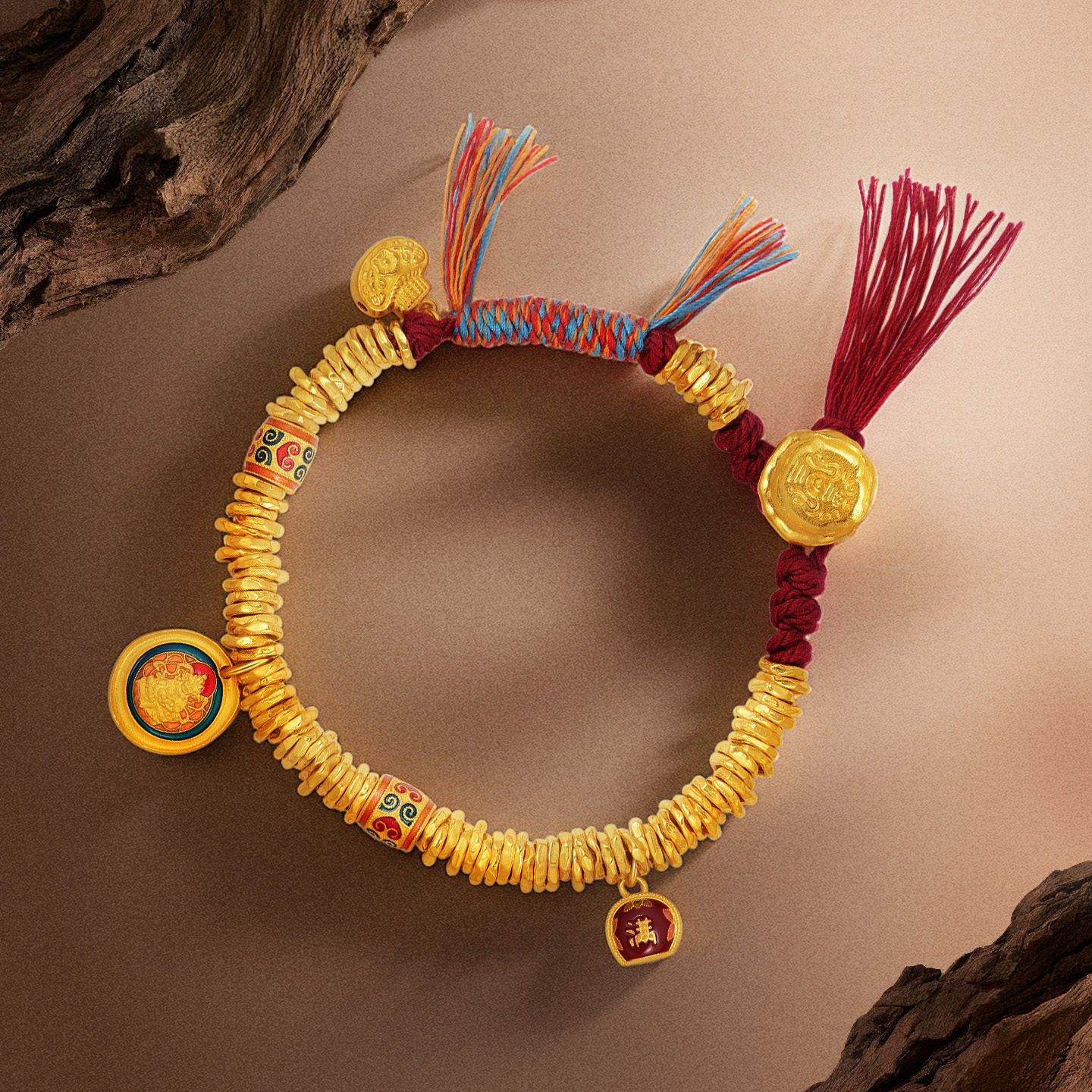 潮宏基臻金珍藏黄财神足金手链古法黄金藏式盘缠金串珠生日 卟