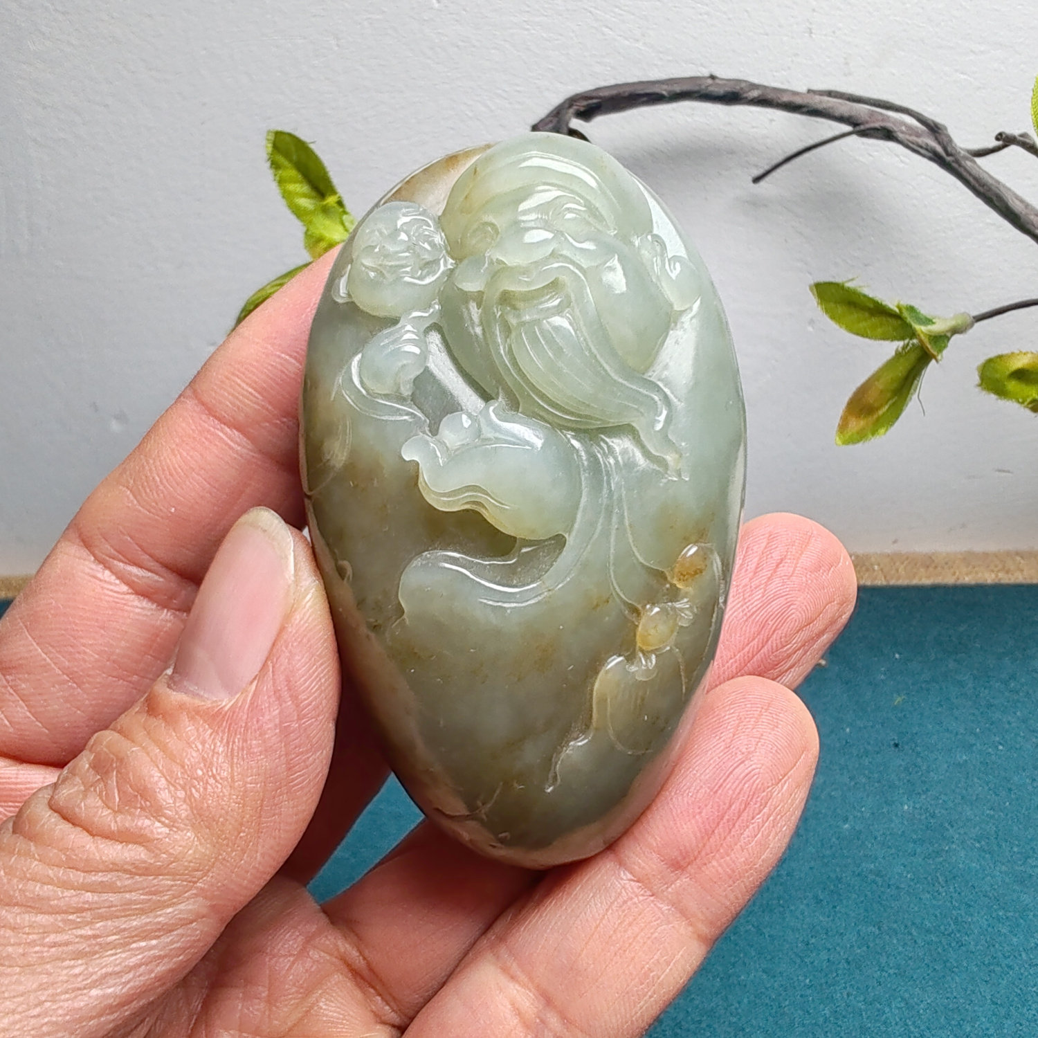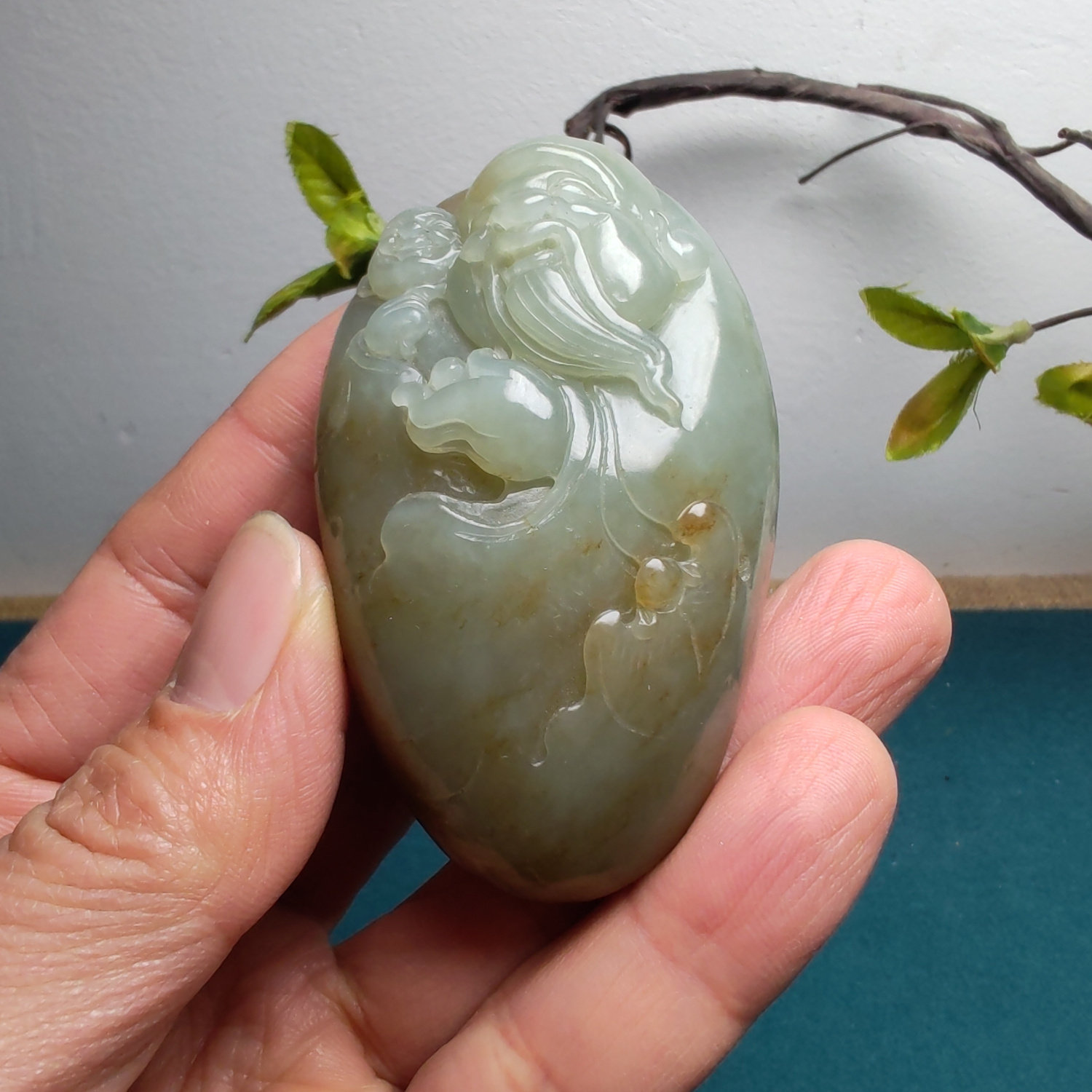 新疆和田玉且末糖青白玉财神童子蝙蝠手把件油润男女国风招财进宝