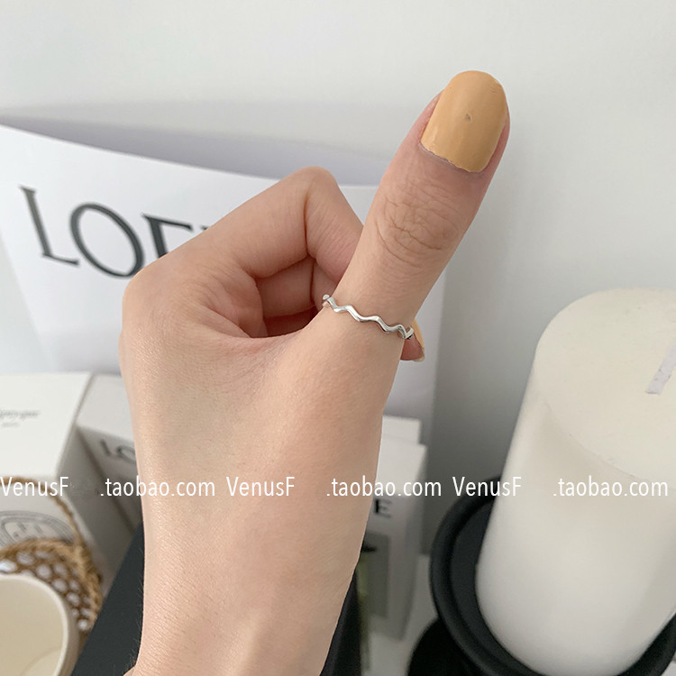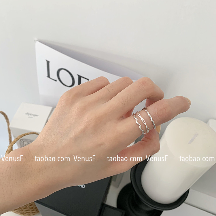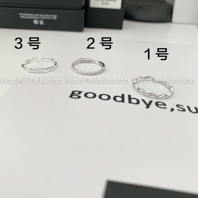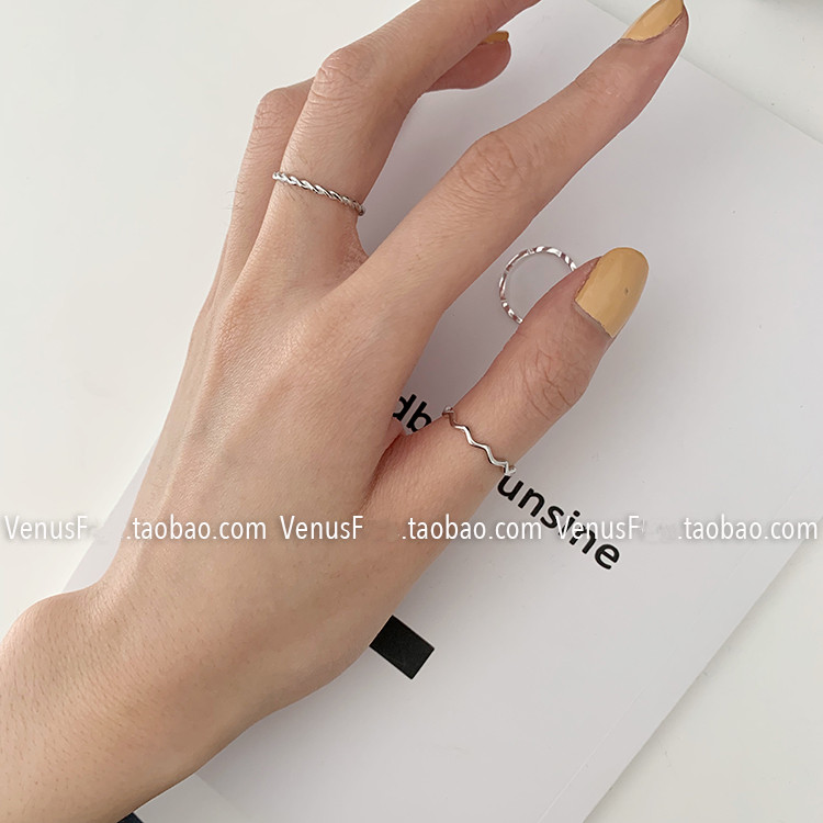 韩国Ins超火 超细极简925纯银大小波浪麻花戒指指环 开口简约欧美