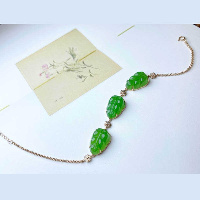 秋季新品18k金镶天然和田碧玉手链冰种苹果绿叶子玉手串a货送老婆