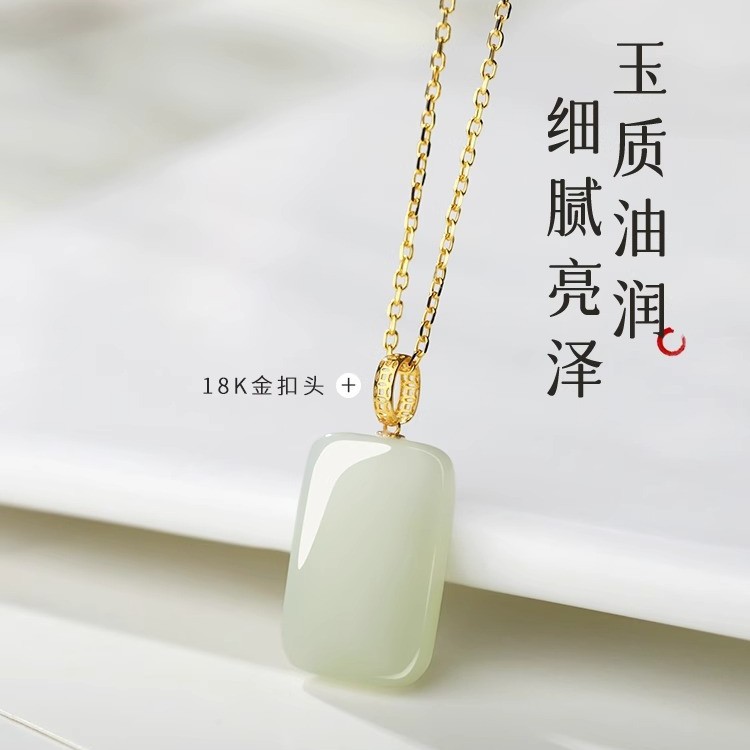 天然和田玉吊坠无事牌玉坠女款 18k金扣头玉佩项链生日礼物送