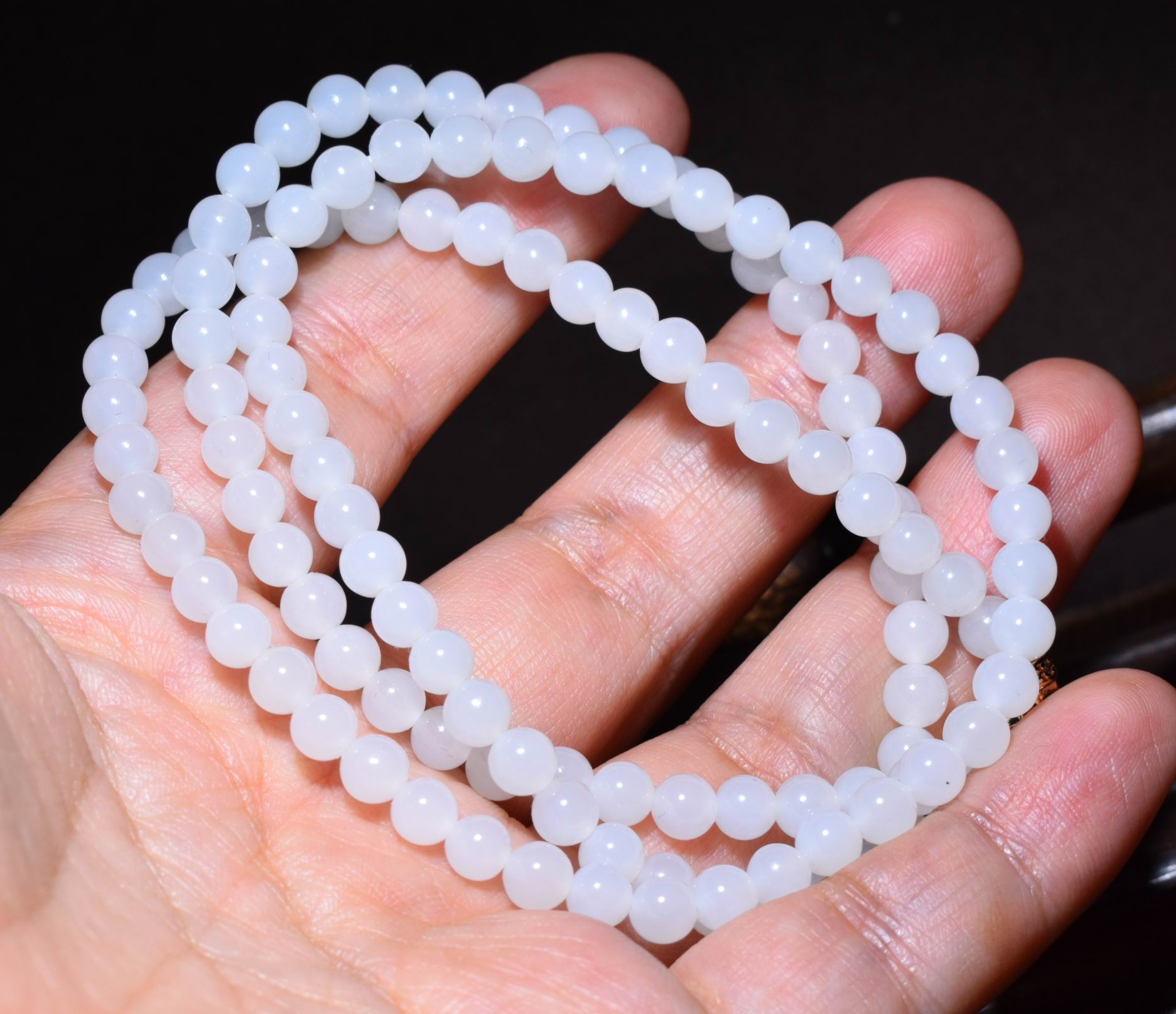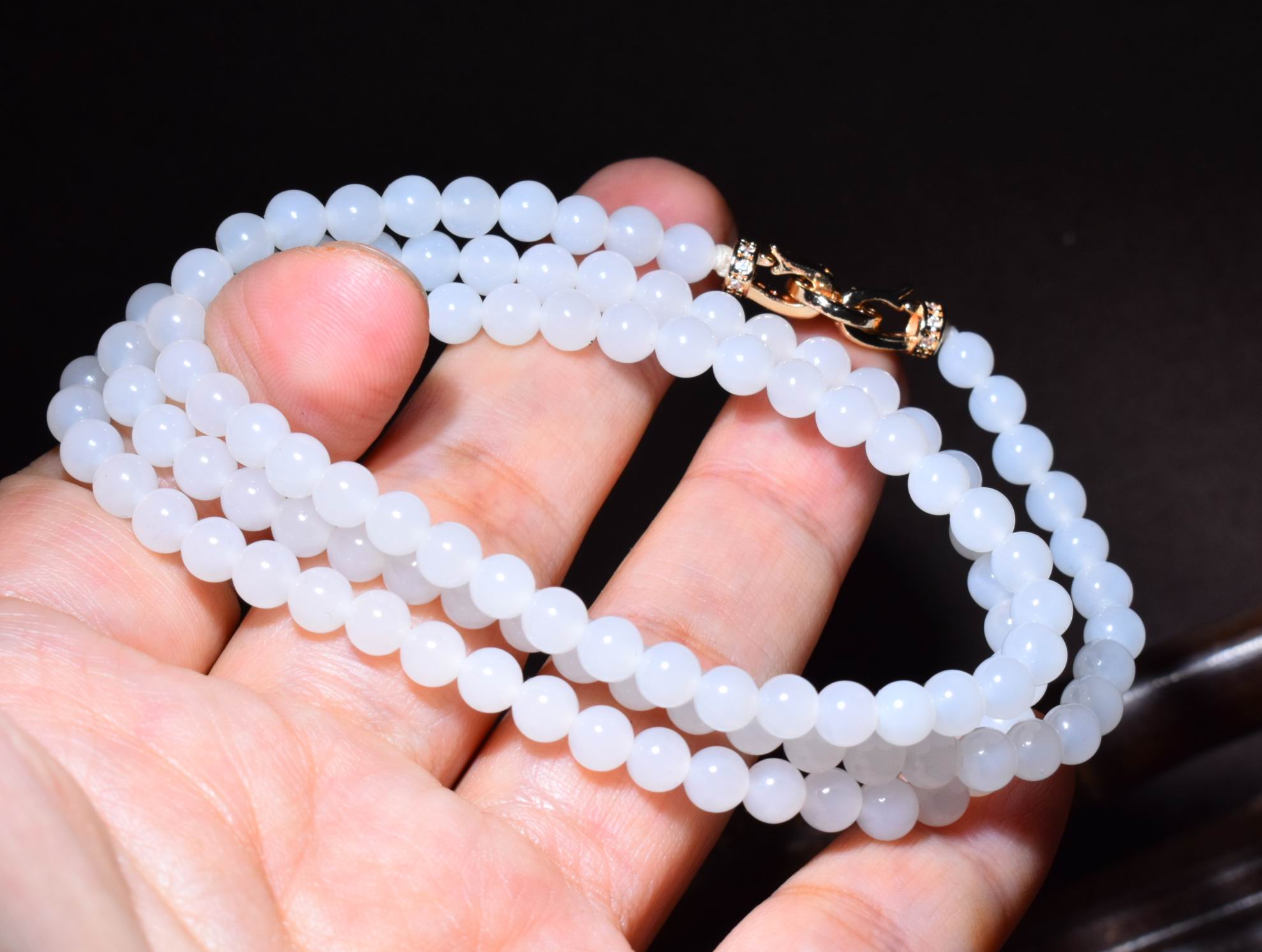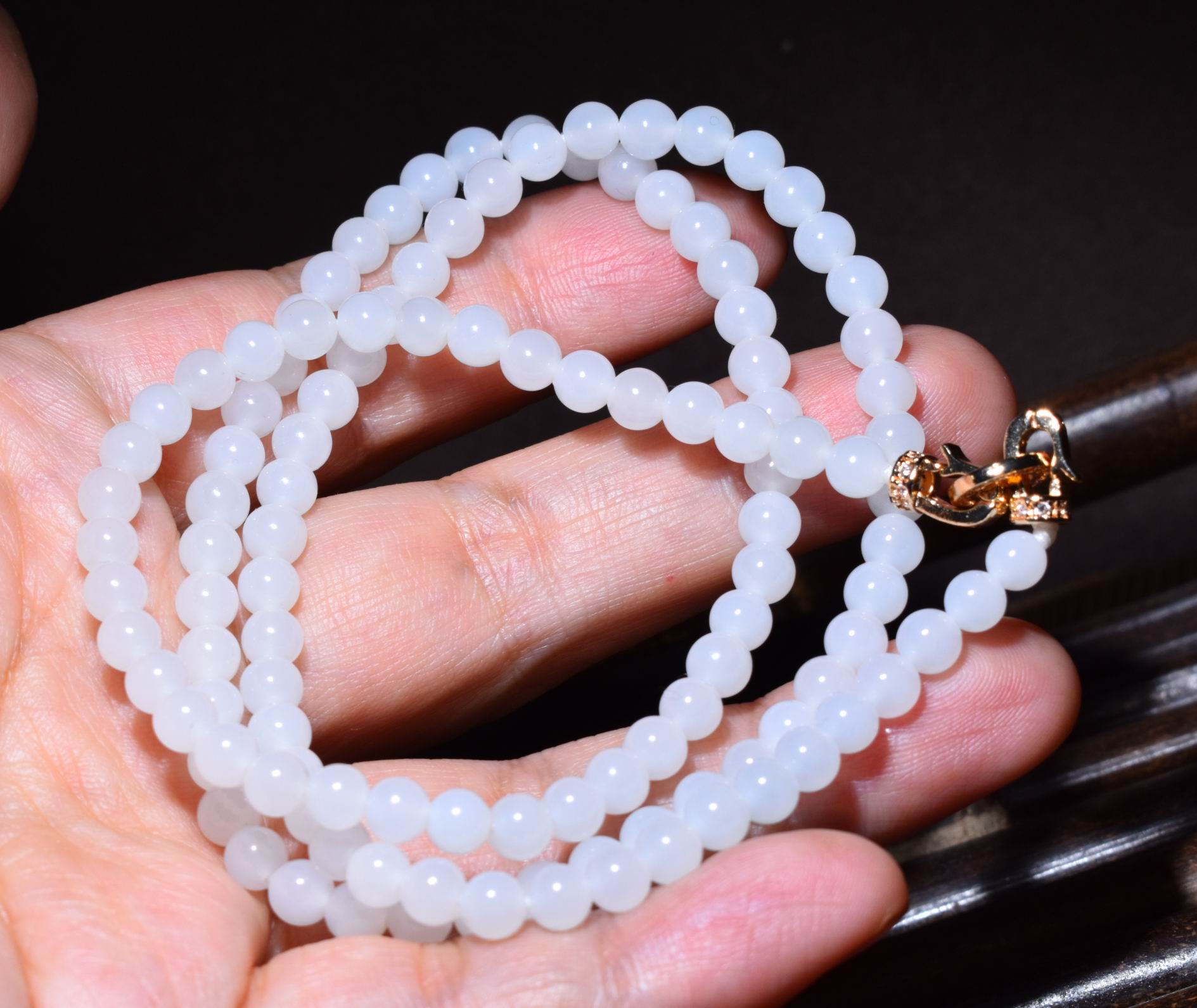 新疆的猫JJ110604 21.8克,直径5mm老坑俄料羊脂白玉圆珠项链