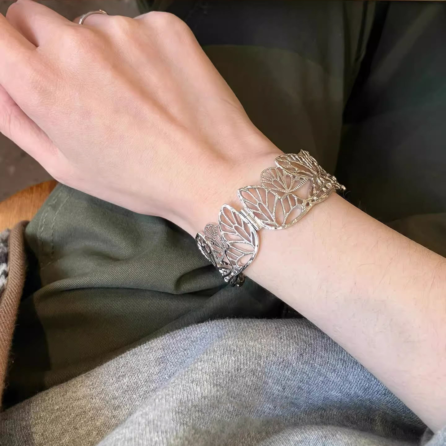 S925纯银不规则镂空蝴蝶花卉手镯女款轻奢小众精致手饰高级感手链