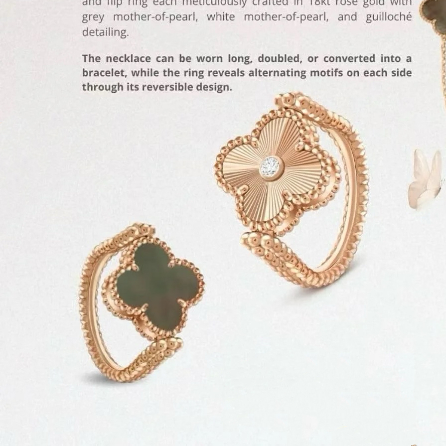 全新高定新款限量灰贝母四叶草可翻转式戒指一面镭射18k玫瑰金