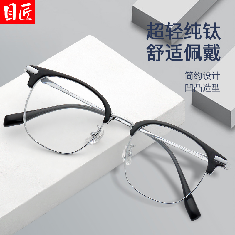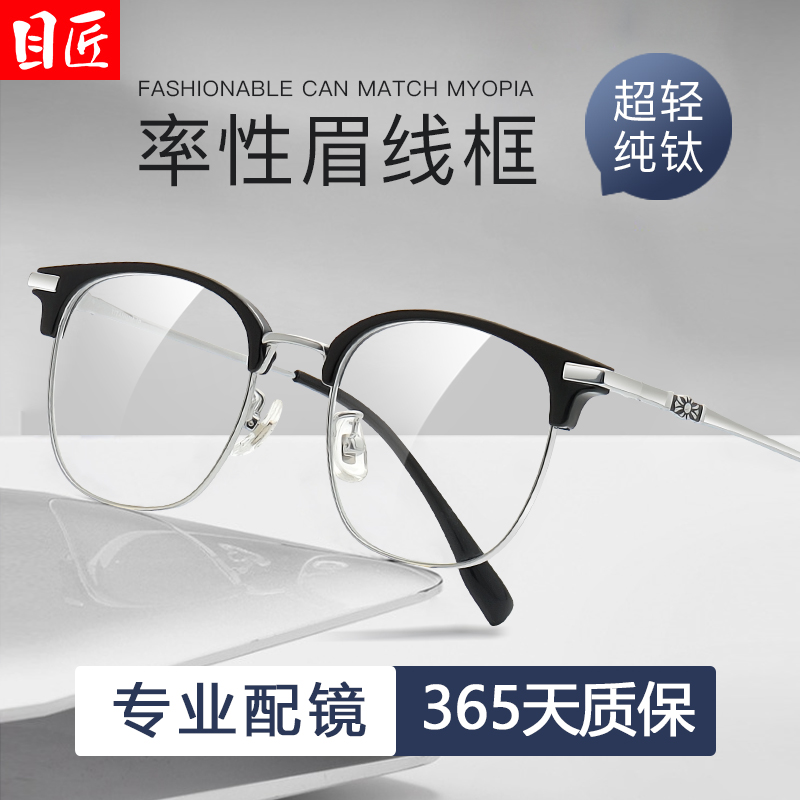 超轻纯钛半框近视眼镜框男款帅气可配度数斯文黑色眉线框男生镜架