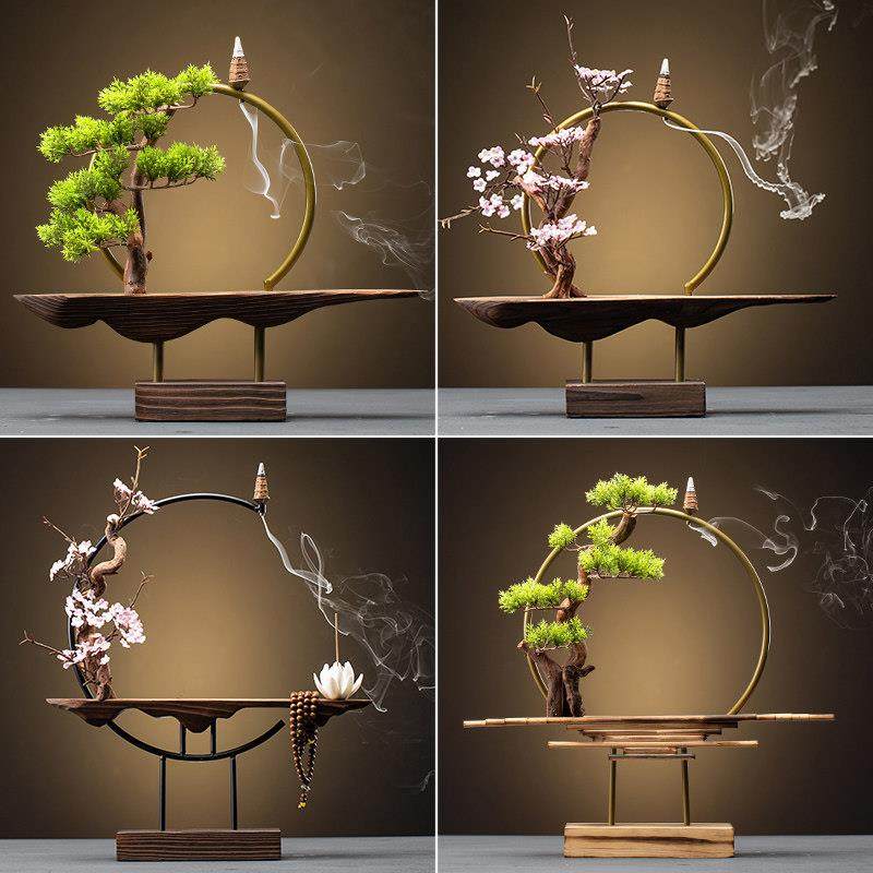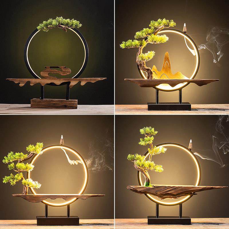 新中式禅意摆件底座风化实木家居摆件客厅办公室玄关书房铁艺灯圈