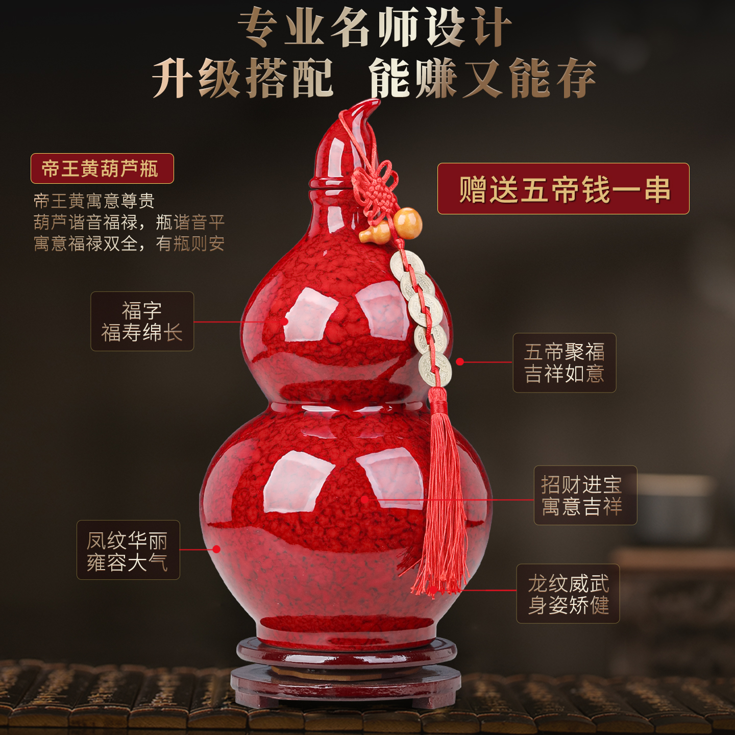 大号红色陶瓷葫芦摆件招财镇宅客厅高级感花瓶景德镇博古架空酒瓶