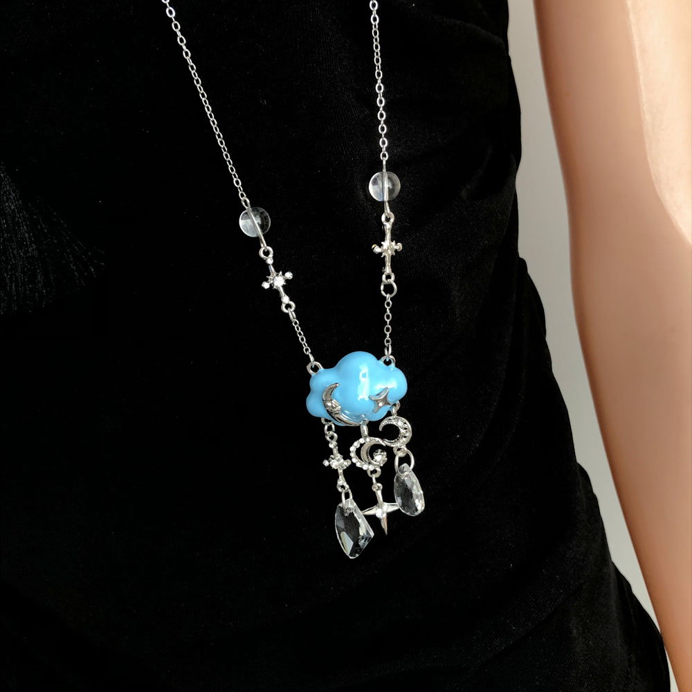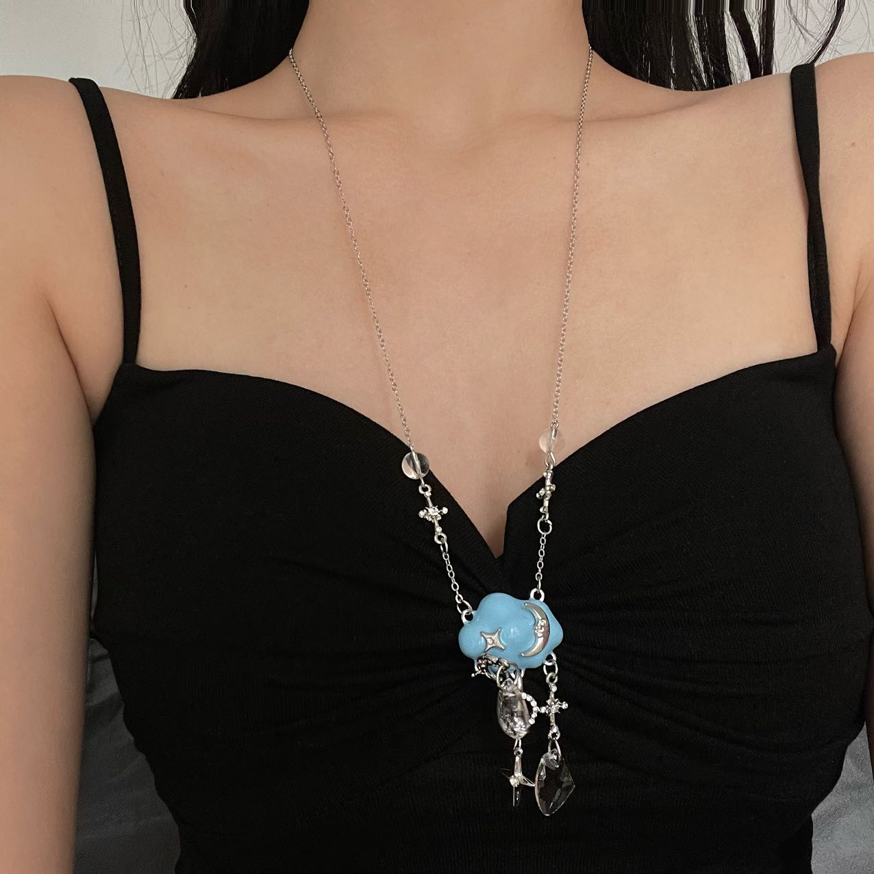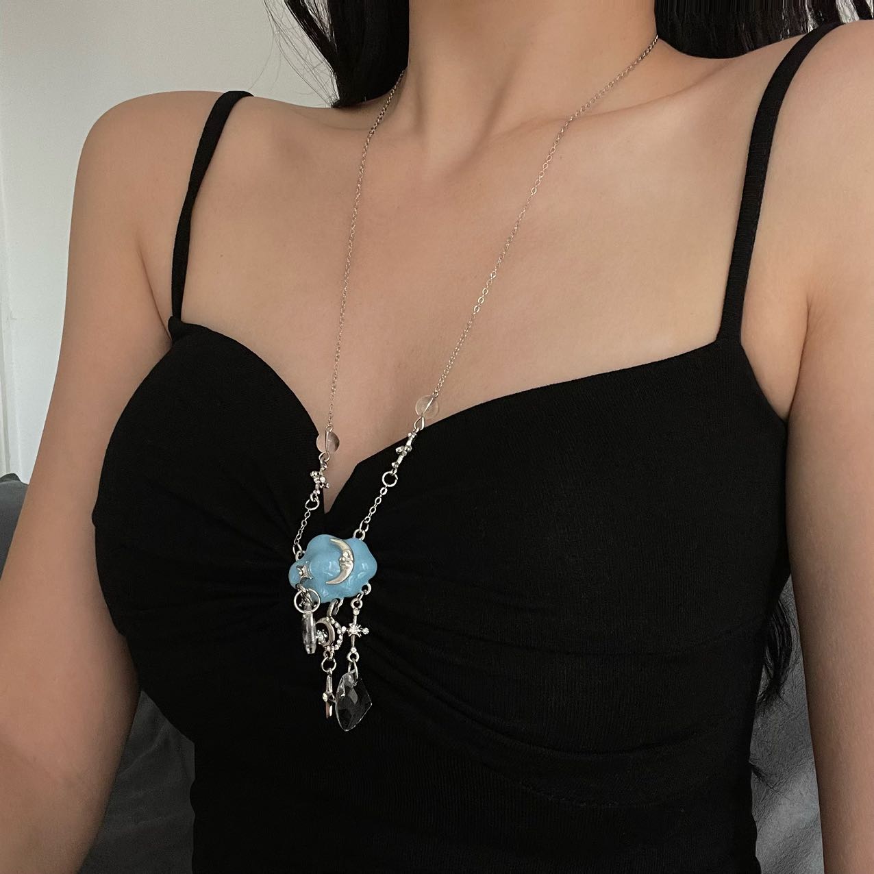气质甜美蓝色云朵月亮水晶流苏项链女时尚简约长链条毛衣链锁骨链