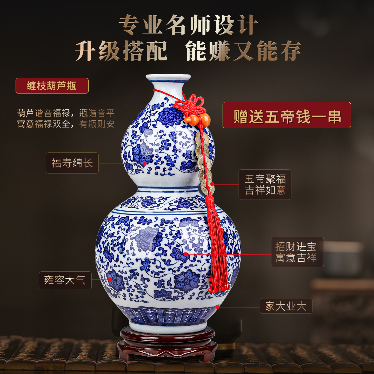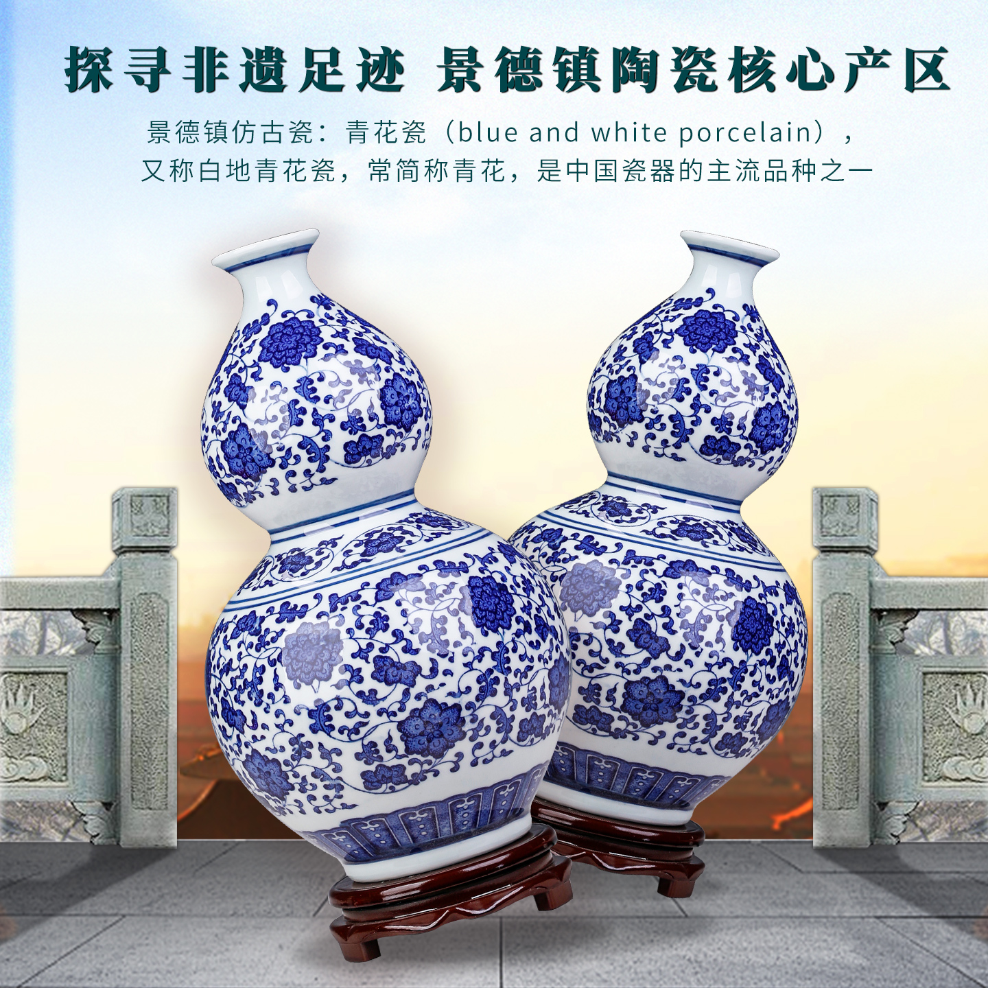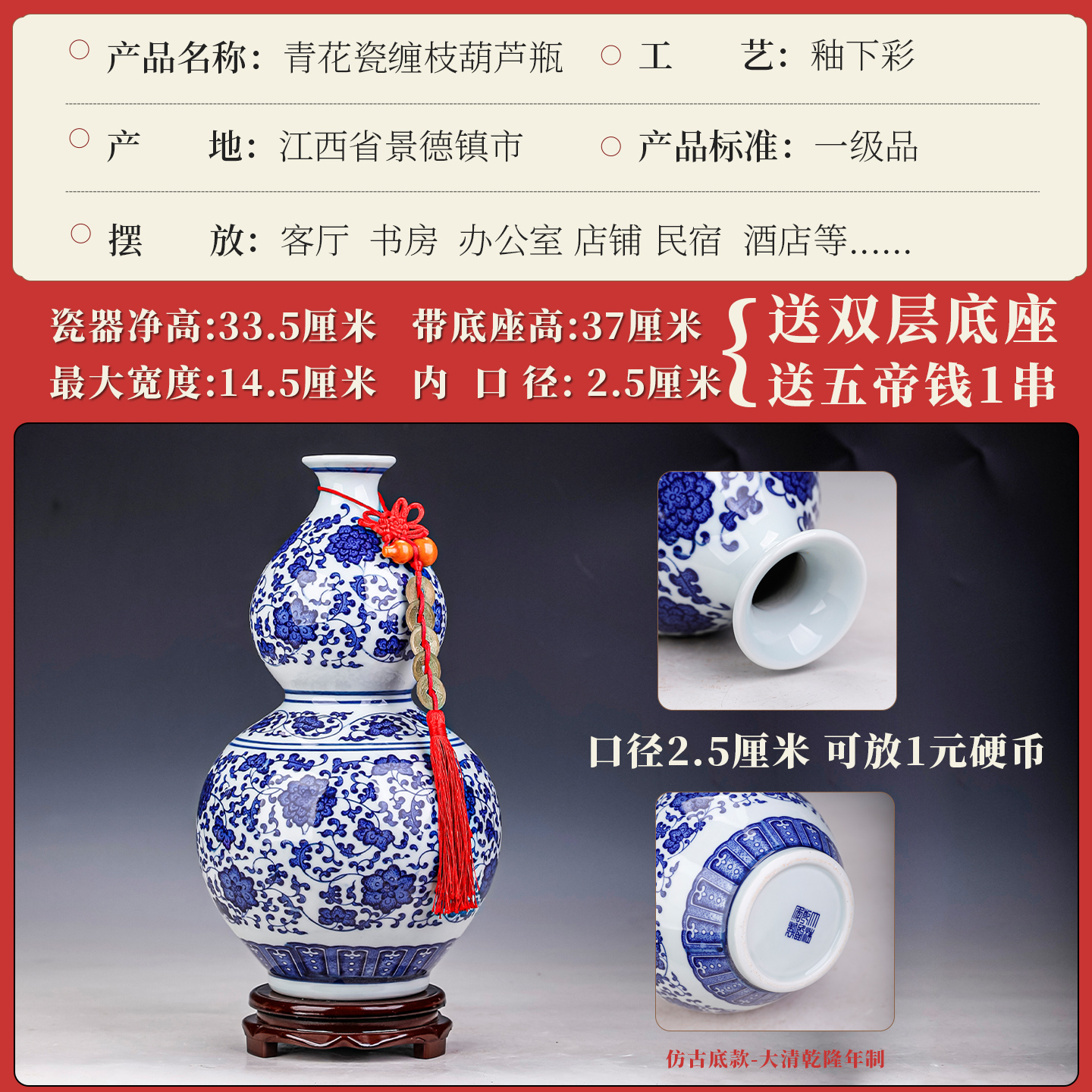 玄关开口陶瓷大葫芦摆件大号客厅镇宅瓷器工艺品景德镇青花瓷花瓶
