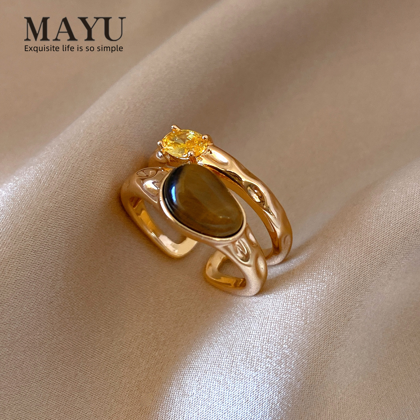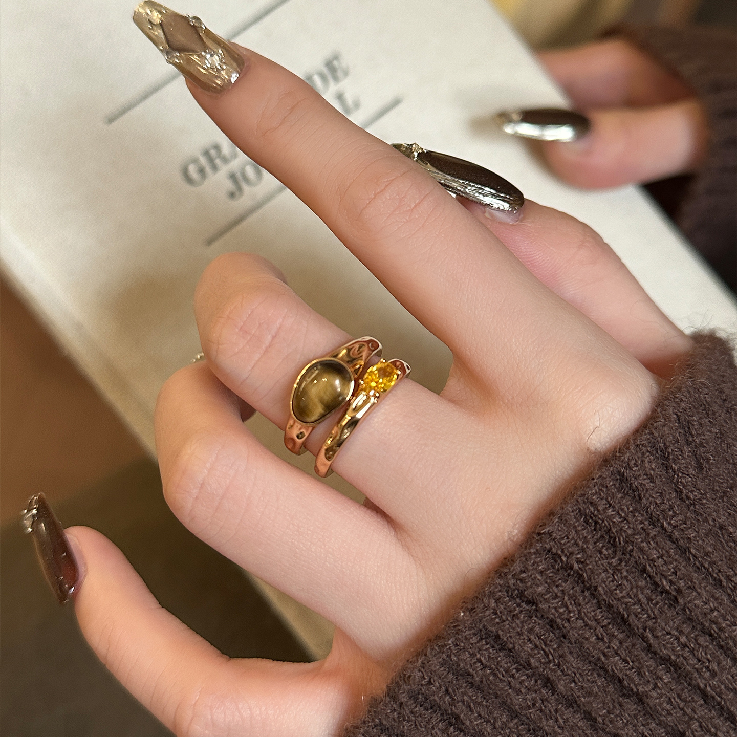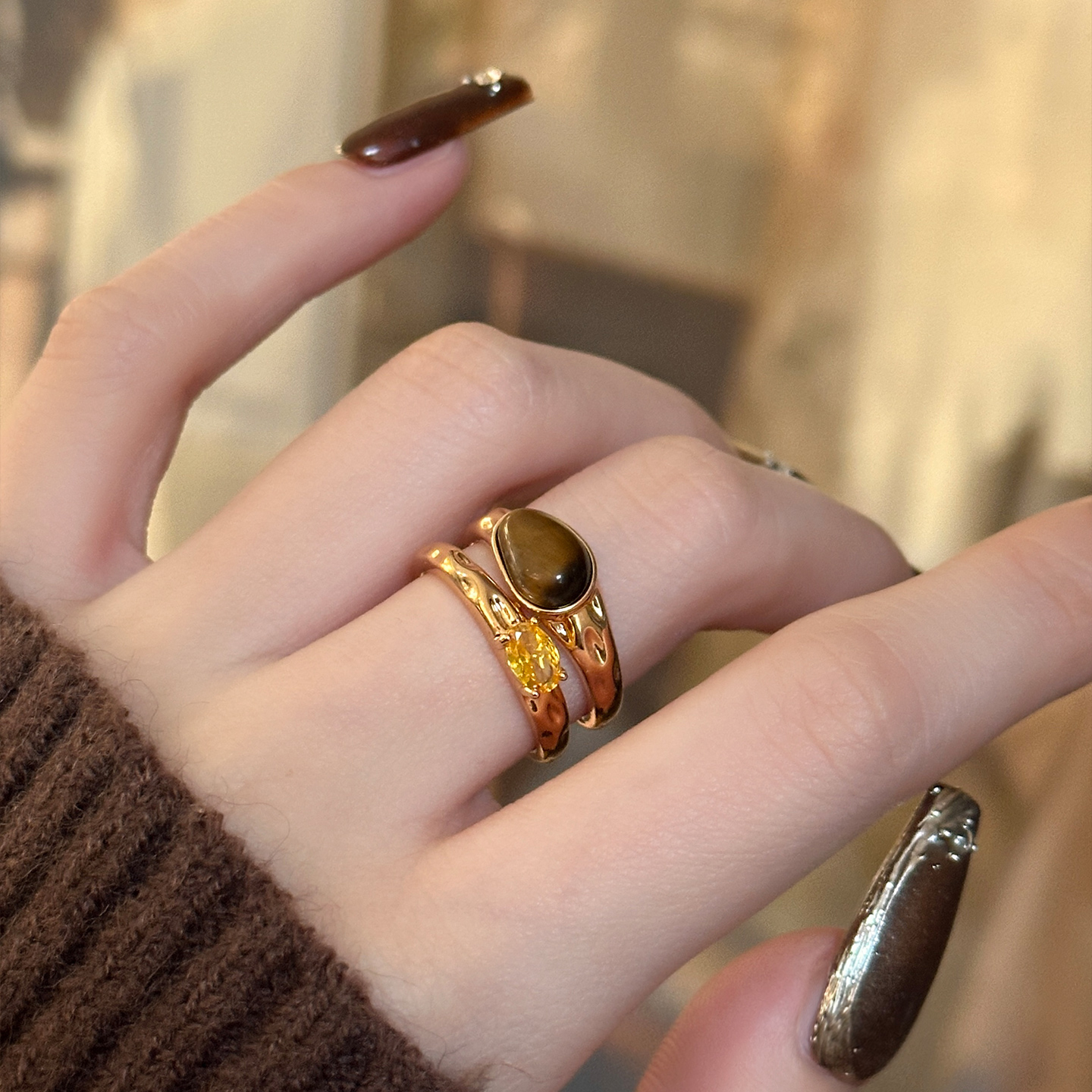 复古美拉德虎眼石中古戒指女生小众设计双层金色食指戒轻奢高级感