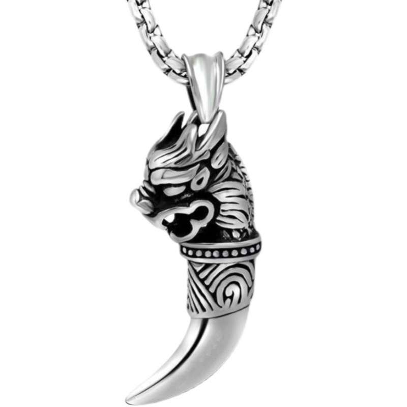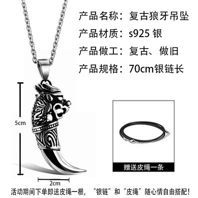 男士狼牙吊坠男项链潮牌百搭纯银个性高端配饰刻字复古挂件挂绳